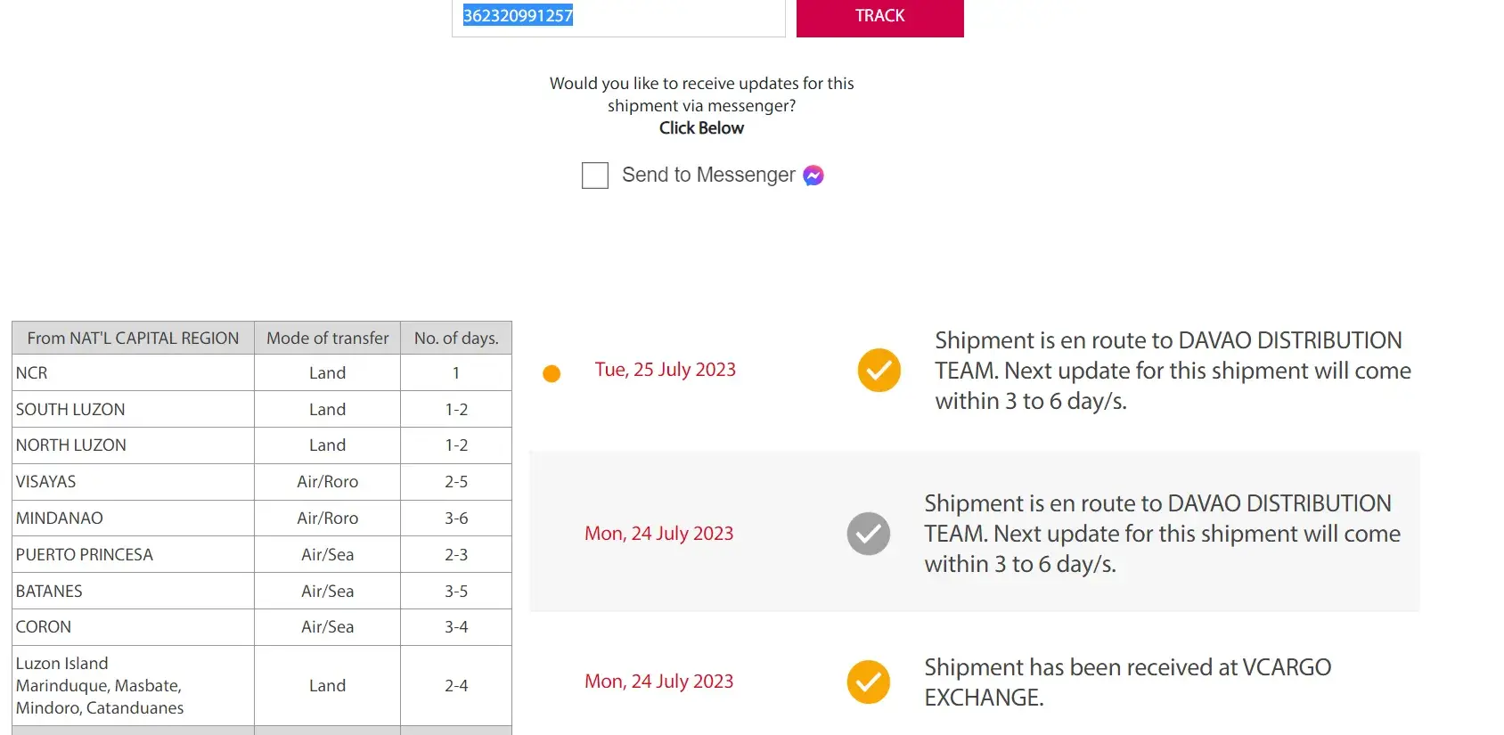 Huling update the tracking ay noong July 25 "Shipment is en route to DAVAO DISTRIBUTION TEAM. Next update for this shipment will come within 3 to 6 day/s." Please, need ko po ng information for my package. It was sent from Ligao City and should be in Davao City this time around.