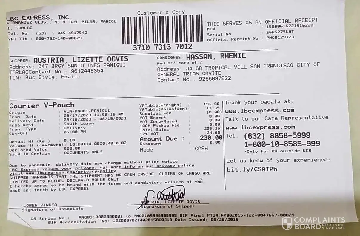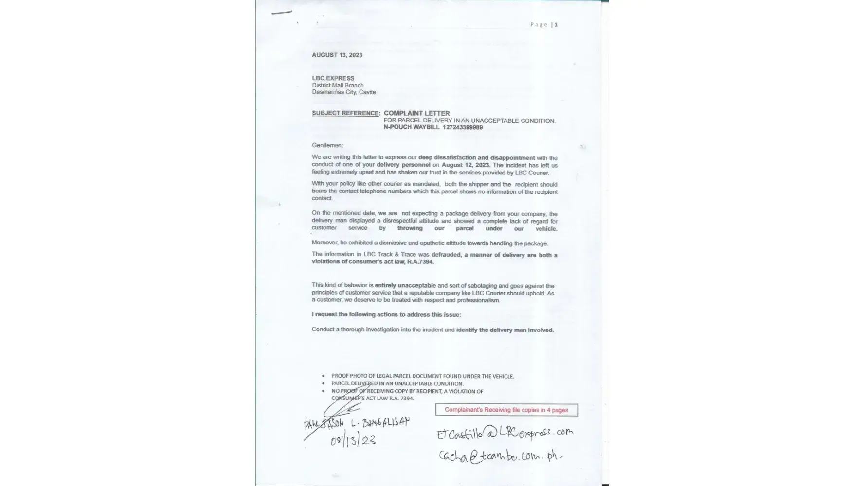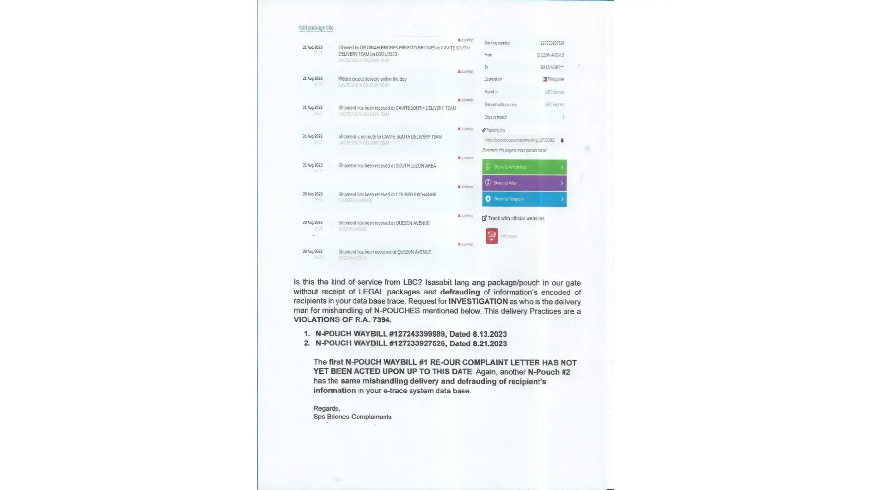 Please find attached letter complaints and again for the second time requested for Investigation of defrauding information encoded in your e-trace delivery. kindly acknowledge this email complaint as our complaint letter has not yet been acted for investigation and NO REPLY received from receipt of this letter at your District Mall branch. Our letter has been emailed to the following LBC email address: [protected]@lbcexpress.com , [protected]@teambc.com.ph. , [protected]@lbcexpress.com dated 8.15.2023 together with this recent N-Pouch mishandling & defrauding information delivery of 8.21.2023