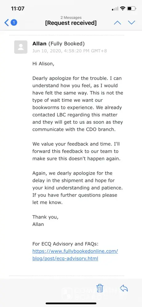 My friend contacted FullyBooked and has said they emailed LBC about it. I myself has contacted LBC through email and messenger but 5 days later and they haven't replied yet. I did not expect for their customer service to be that bad. Please get back to me as soon as possible with news about my package.
