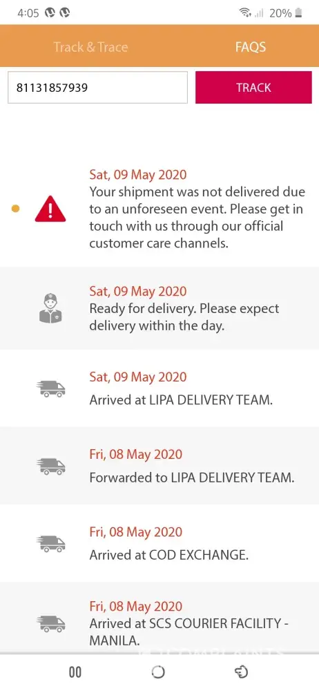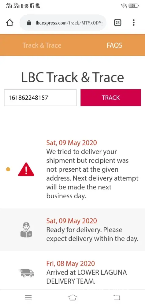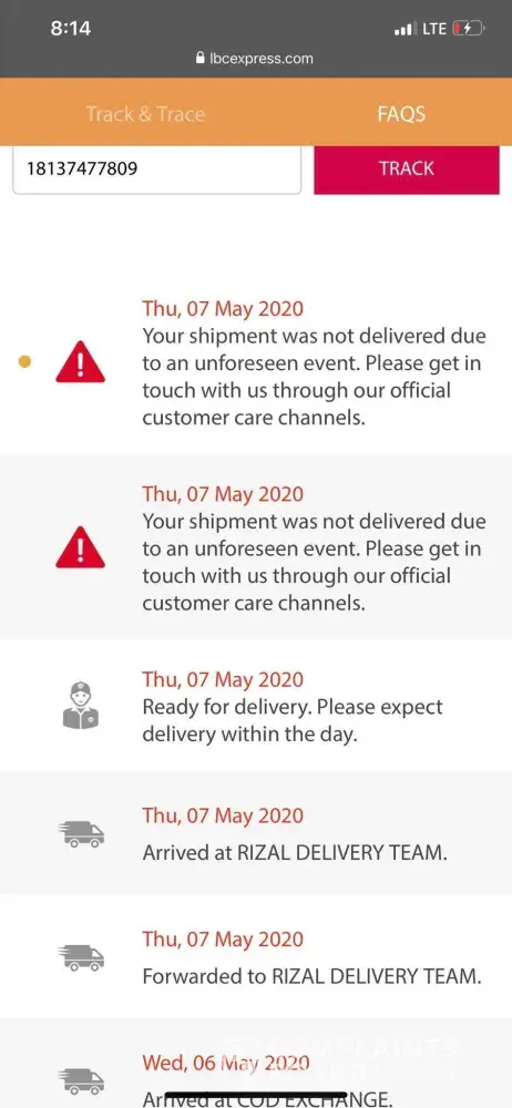 Yung package ko for delivery today according sa LBC tracking. Naghintay ako buong araw. Walang text or call. Then pagkacheck ko sa tracking.. not delivered daw due to unforeseen event. tumawag ako sa hotline. Nag email ako. Ngchat ako sa FB messenger. Walang sagot kahit isa. Asan mapupunta ung package? Idedeliver ba ulit or saan ba pwede kunin? Pls. Pakisagot naman.pls lang.
