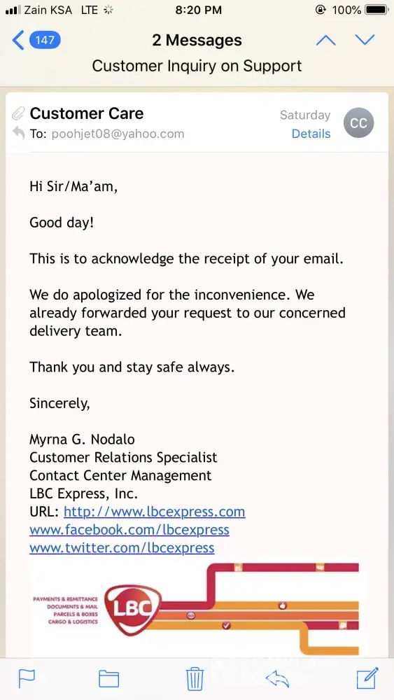 Hi lbc. pang-3x q ng email to. to be honest i'm trying to control my anger pero nakakainis na po kayo. ung package with tracking # [protected] na sinend noong march 20, 2020 hanggang ngayon wala pa din. ung recipient nakareceived n ng packackage from manila ang pampanga, pero ung sakin n from qc wala pa din. nkiusap aq ng maayos sa previous email q pero ndi ata effective sa inyo ang maayos na usapan. kailangan ko pa bang magmura para mapansin niyo na super delayed na yung package!🤬🤬🤬