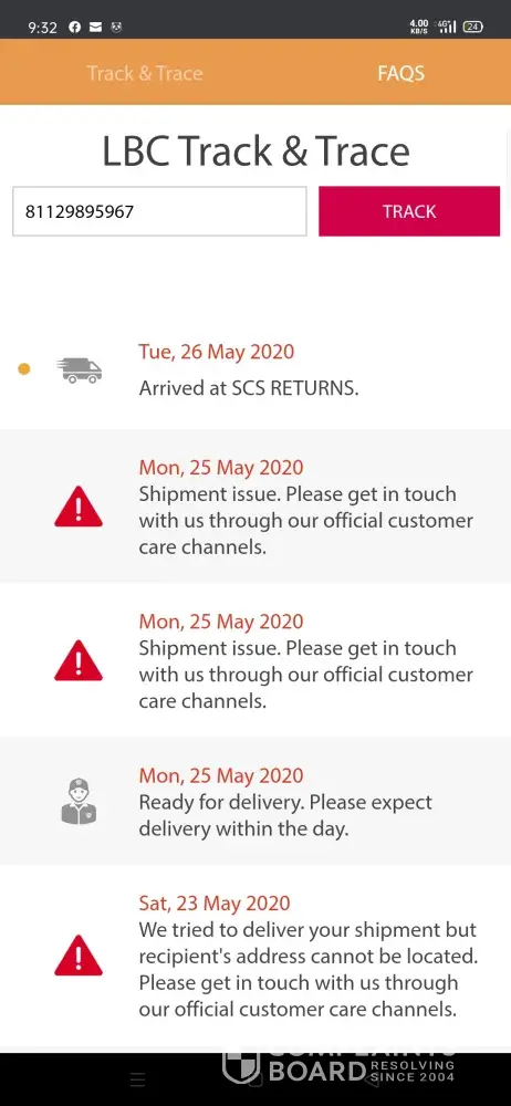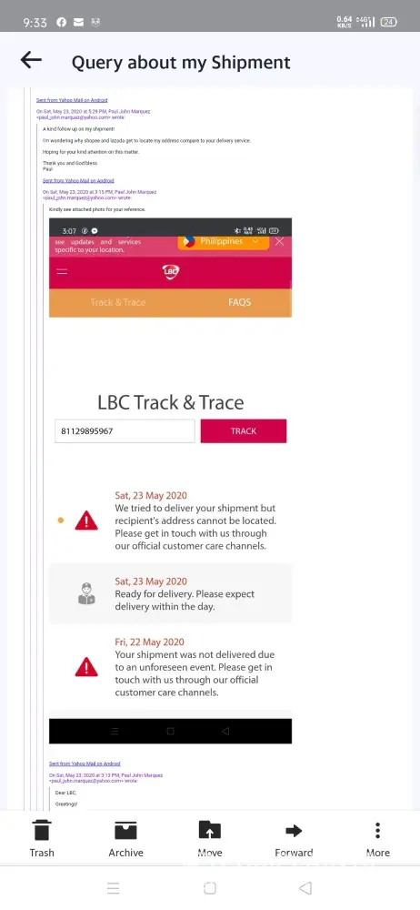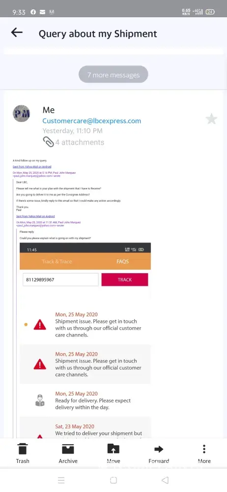 I'm trying to track my shipment that's about to deliver to me as a consignee. However some issue occurred as reflected on the LBC track and trace while in delivery attempt. as per advise, have to contact the customer service with a given email address.