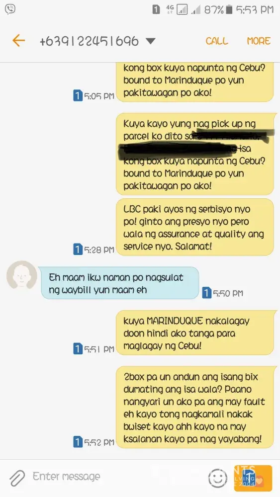 Hi lbc contacted your customer service but no response yet pleasr check parcel boud to marinduque but was in cebu based on your track your parcel! Tracking number [protected] please check tjis had been pick up 15 may 2020 and no feedback until now! And the personnel who pick up is bad [censored] to blame it on me forgot to have his name but he picks up packages dor2dor services from makati main.