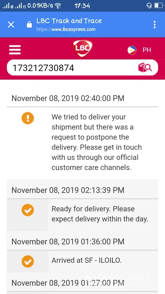 I tried to ask assistance from other lbc office because I can not go back to Cebu because I only visited that place. I have an lbc receipt as a proof of my payment through Leige Bonajos, customer associate of lbc with AR# PUNO3FU301567008149.
