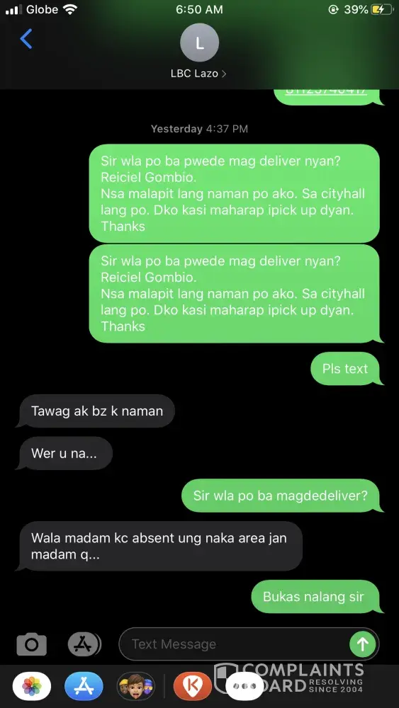Hi, Good day. Today I went your LBC Headquarter in Cebu to clarify my shipment unfortunately my parcel he send it back to the sender without knowing me or consent. Last week November 8, 2019 I received a text from LBC express that I have parcel to receive unfortunately I'm not in the house I was heading going airport for urgent appointment. So later, this guy from LBC courier texted me asking my location, I told him if can you hold my parcel because I'm not in house, See you on Monday. Yesterday November 11, 2019 LBC express texted me again that I have parcel to receive today this guy i texted him right away that I'm already in Cebu but any one if my messages on him he didn't answer or replied. That's not right because why he send back my parcel to the sender without knowing me. He should communicate me because I have a parcel and thats very important I order it online my vitamins. I trace his name Mr. Tuñacao, mobile# +[protected], reference # [protected]. Thank you!