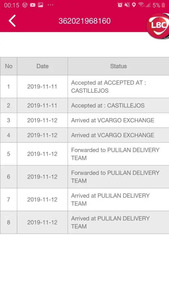 I bought an item which was shipped by the seller on Nov. 6, 2019. At 11 pm it said it arrived at the Visayas Area and at 12 am on Nov. 7, 2019 it was forwarded to Talisay Delivery Team. Until now wala paring change sa status. It's been 2 days na wala pa rin ang package. Come on LBC! Nakakapwerhisyo na kayo. Walang tao sa bahay this weekend, how am I supposed to receive it kung ganon? Customer nyo ba mag aadjust dahil sa delay na kayo ang megawa?