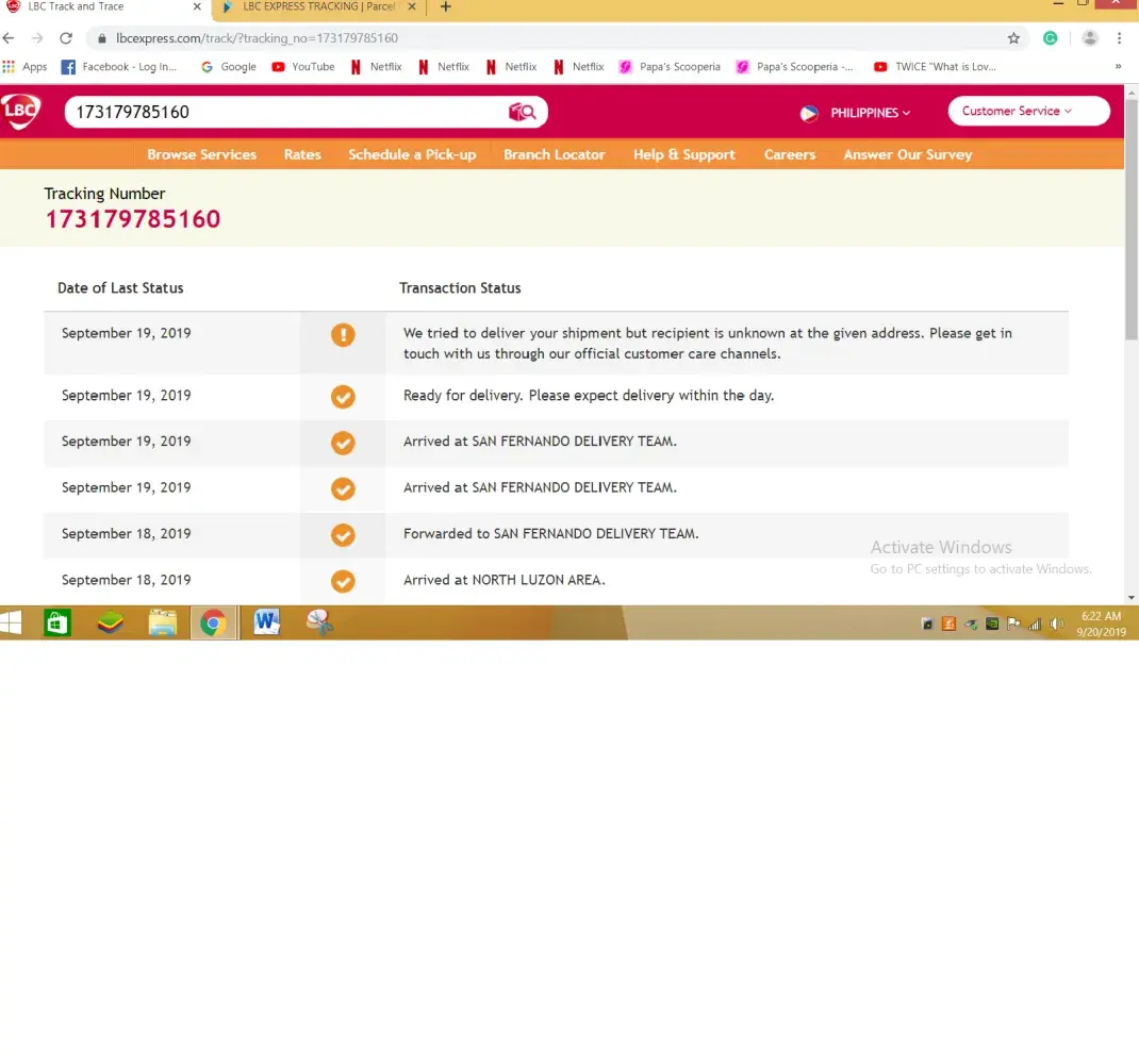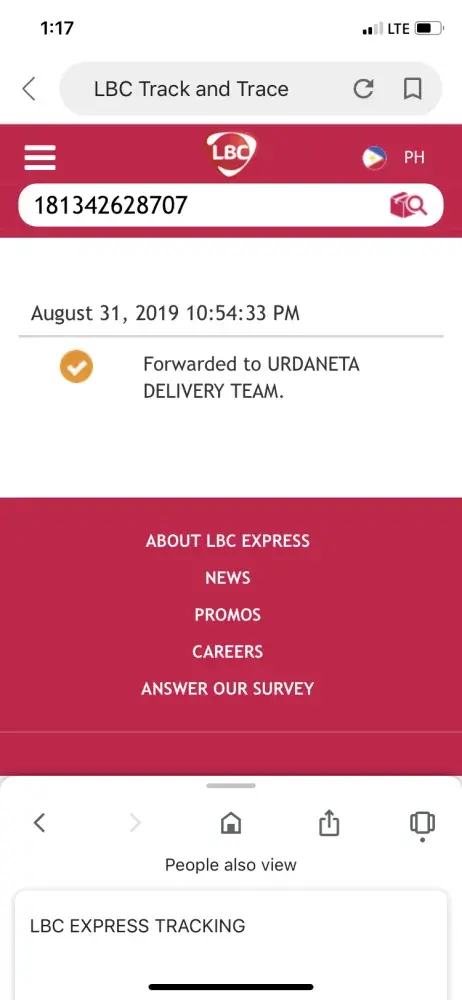 I trace the tracking number it was already at the urdaneta teams since aug 31, 2019 until now . I already ask help from LBC SM batangas Branch since last week but i dont get any reply regarding this matter