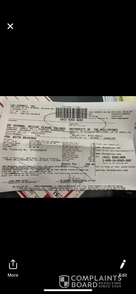 I would like to send back your associate namely Baby Karren Ramirez in the training room. I think she needs to review the proper way to handle customers. She act so arrogant and sarcastic, the way she spoke to me a while ago. She keep dragging that a few docs should be place in a bigger pouch and because of that I'm the one who packed it to show to her that it may fit. She also do smirk smile to me for my 1k peso bill as payment. I also showed my wallet that its filled with blue bills and no smaller bill. Your front liners should be polite at all times. Lastly, she told me the sealing of the packaging should be done by them, where the other customer on my left do it on her own. I'm a weekly customer of LBC I send weekly reports to my boss she should enlighten that without us she has no job at all.