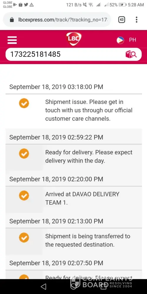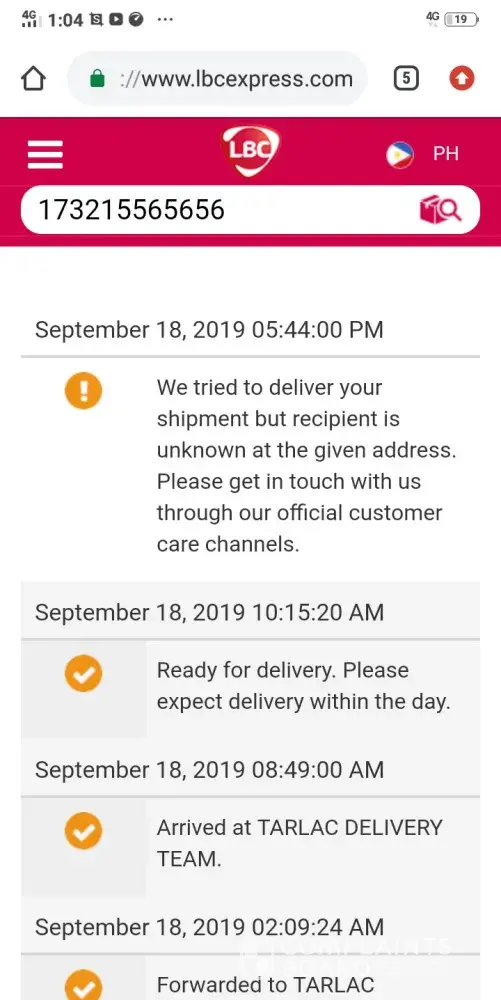 Hello lbc.. Complain lang po sa deliveries ng package bound to marilao bulacan.. Dated sept 15, 2019.. With tracking no.[protected].. Nk 3 days n po kmi. Nag eemail pero c marilao bulacan delivery team hindi pa rin na dedeliver.. Hinahanap n po ni consignee.. Hiyang hiya n po kmi.. Sana nman po. Ma ayos nyo delivery trsm kung sino po responsible jan.. Please please po.. Kaya kmi lbc.. Alam nmin good ang service nyo.. Please do something for this. Asap po..