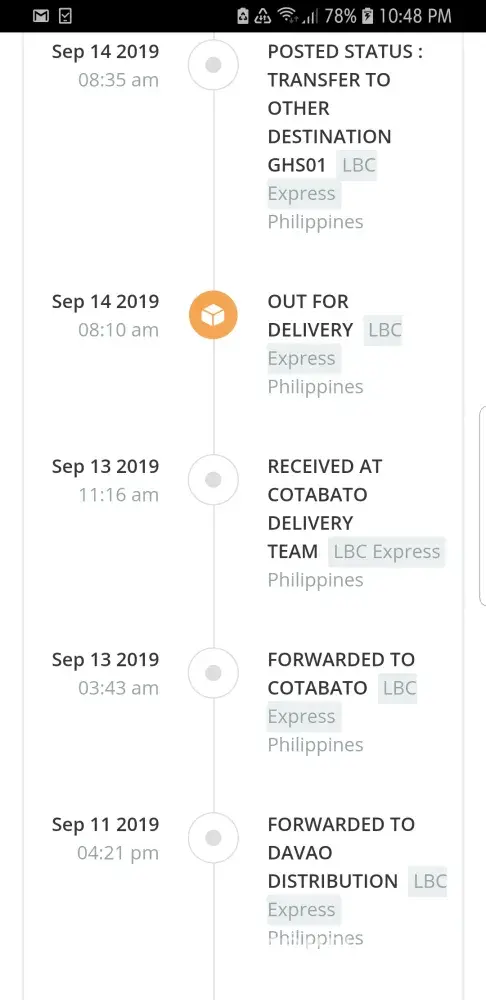 My parcel with tracking number [protected] with transfer date, Sept. 10, 2019 and delivery date, Sept. 12, 2019. It originated from Butuan, Agusan del Norte on Sept. 10, 2019 and was forwarded to Davao distribution on Sept. 11. From Davao, it was received in Cotabato distribution on Sept. 13 and was out for delivery on Sept. 14. The slight delay from the supposed delivery date is forgivable except that my package was delivered to the wrong distribution area. My address is in SOUTH COTABATO and not in Cotabato City. It should have been forwarded to General Santos and not in Davao. On Sept. 14, it was transferred to other destination and no update since. The content of the package is supposed to be handcarried by my cousin back to the US on Sept. 16 but since the delivery is not to be expected before that date, we will have to pay for shipping for the items to be delivered to New York. I just want to emphasize the ripple effect of one mistake of your employee to your customers who chose your company because they believed it is the fastest courier to deliver their packages. And i am one of those disillusioned.