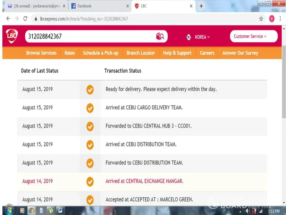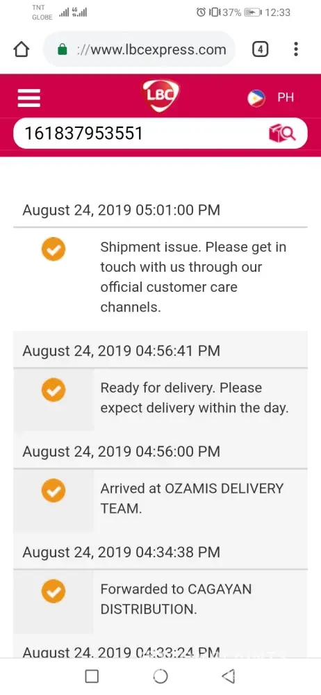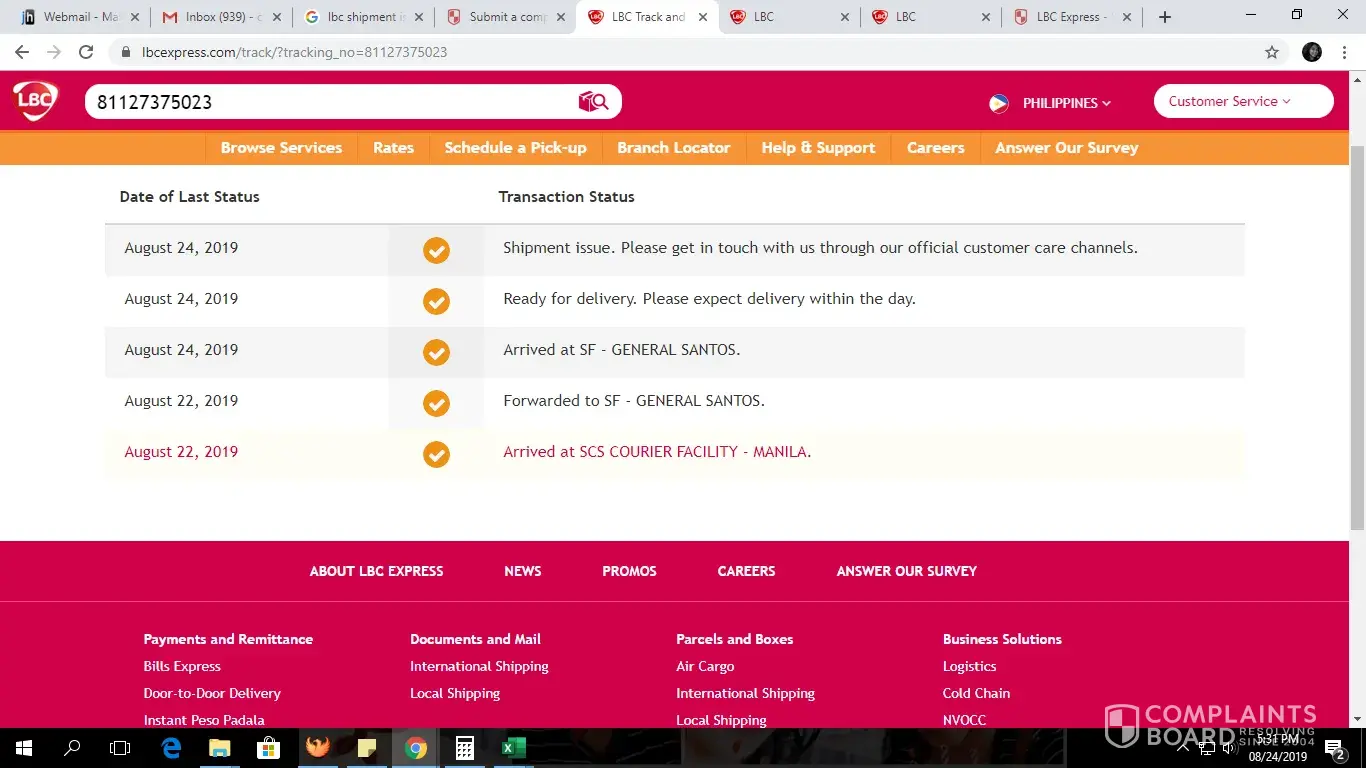4. Numerous follow-ups were made but until now, AUGUST 13, 2019, THE PACKAGE WAS STILL NOT DELIVERED! PACKAGE IS STILL IN BATAAN FOR 2 WEEKS NOW.