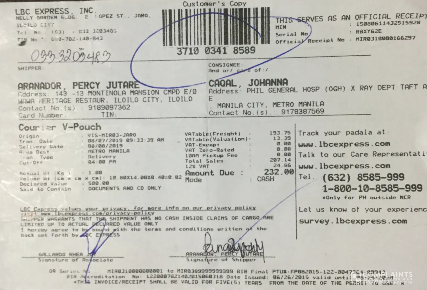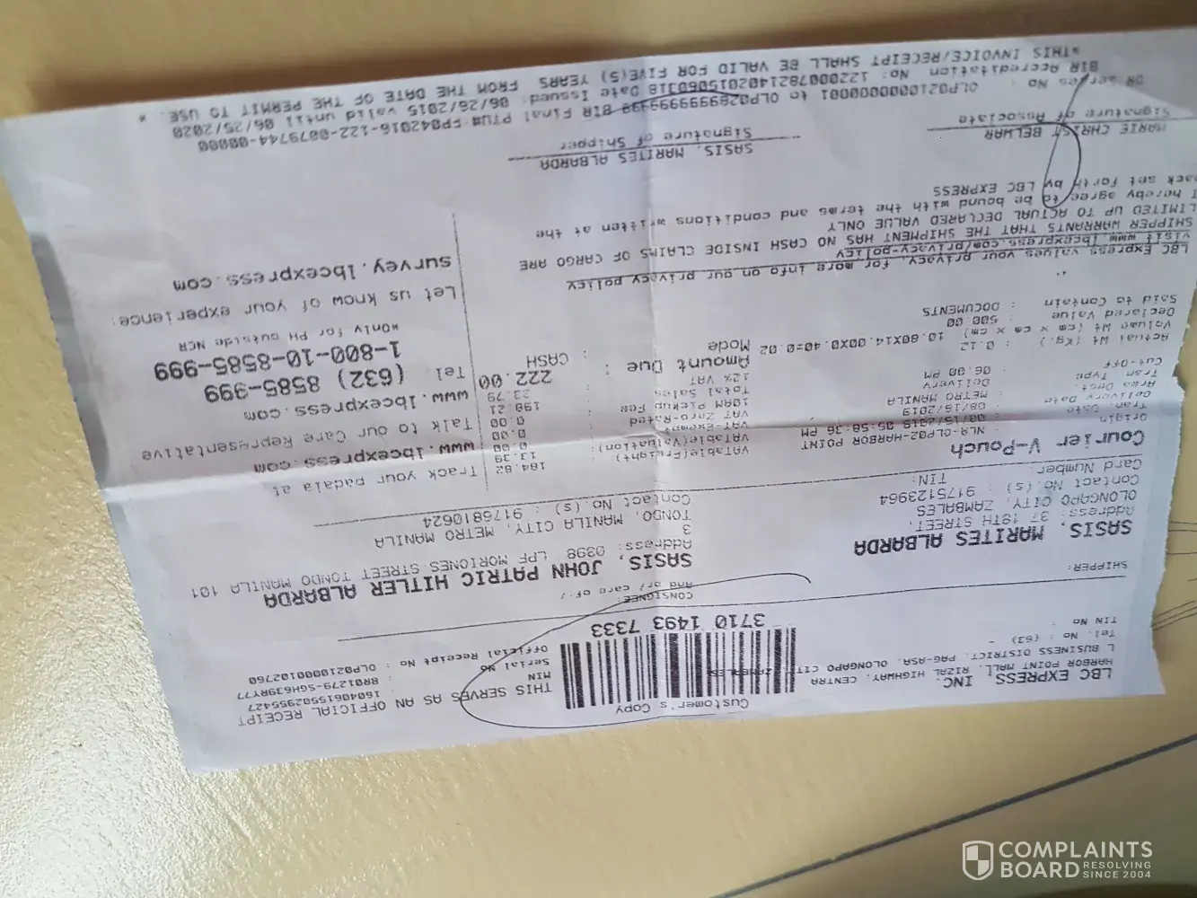 Hi! I am the shipper, hopefully my complaint will be addressed to the management of LBC. I've send the document dated August 15, 2019 until now the consignee haven't receive any.