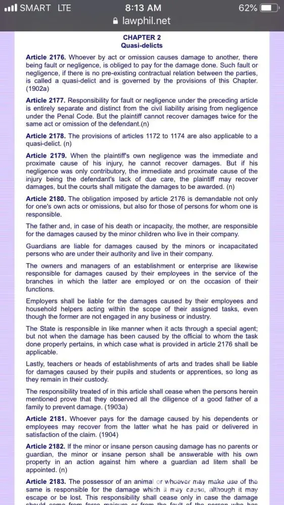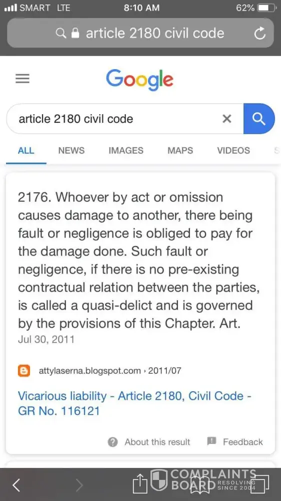 After having paid the amount of the parcel, and I suppose with Marlon Tiama realizing that his actions and words were wrong the entire time, he walked to me to apologize and checked on my head. It was at this time that he admitted that they have long been complaining about getting that ceiling fixed. In his own words in Tagalog, "ser matagal na ho namin yang inirereklamo." So this, is a clear sign of NEGLIGENCE in the part of LBC and whoever is in-charge. (Note: there is a law on this which I Googled; I included a screenshot to this mail)