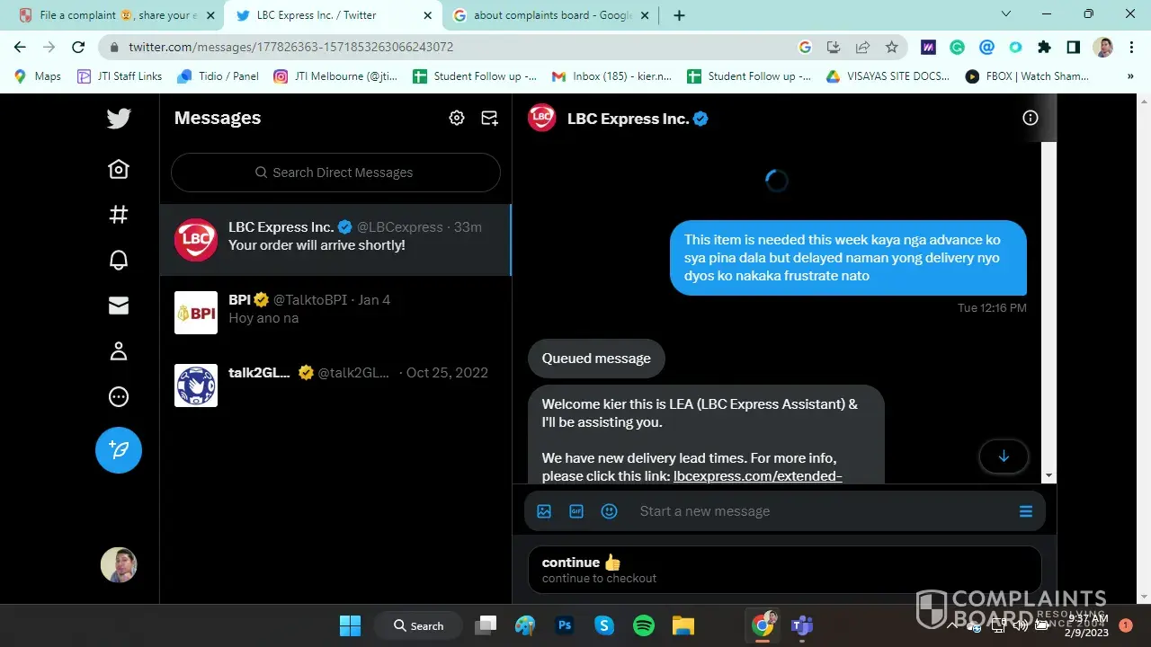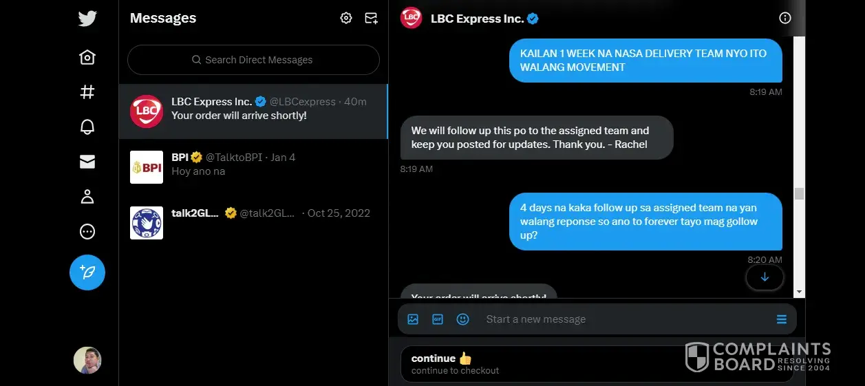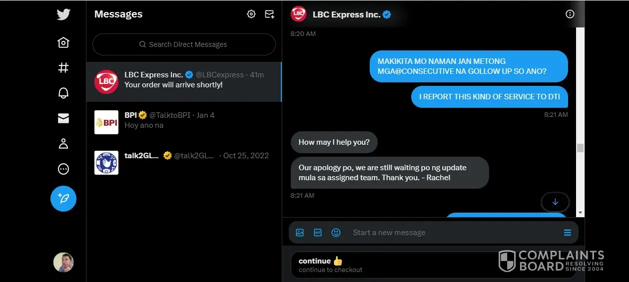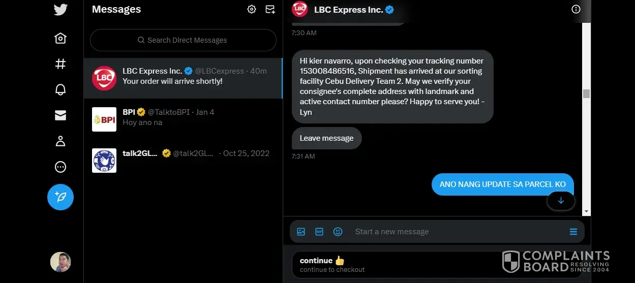 My complain is Yung bdo credit card ko dumating na pala Wala man lang text or any update from LBC then sa tracker and sa customer service nila nagpapasapasahan lng cla Kung sino lalapitan Kung Hindi pa ako pumunta sa bdo ndi ko pa naayos Yung problema.