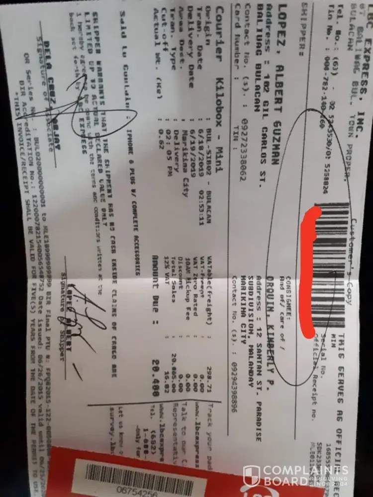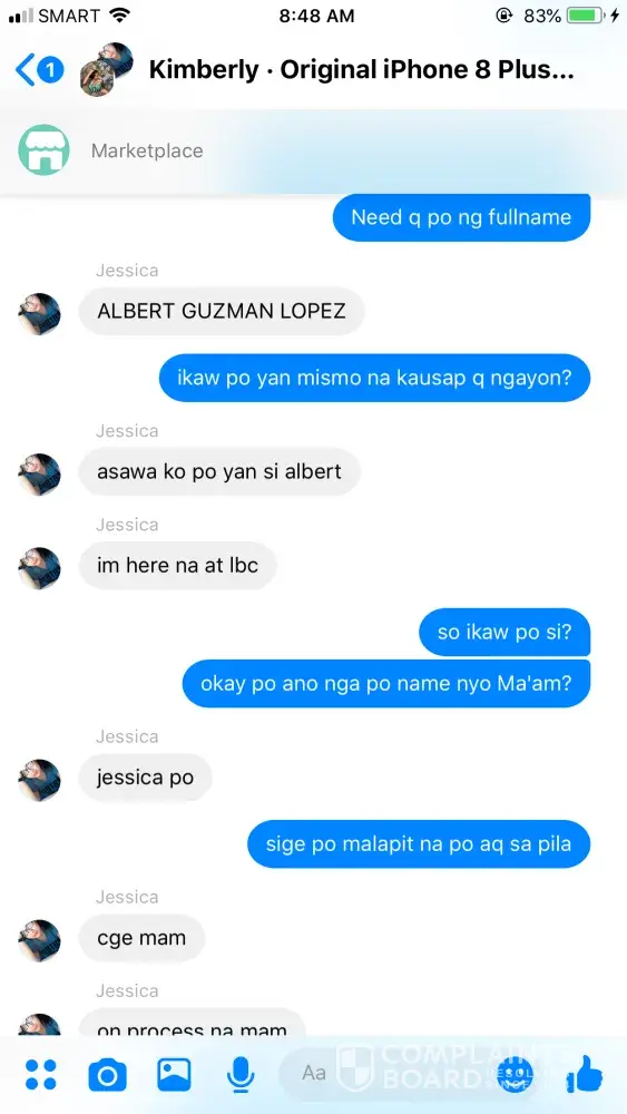 June 18, 2019, I made a transaction through LBC (pera padala). It's suppose to be a payment for an Iphone 8 plus buy the seller/scammer who's name is "Jessica V. Lopez" but using "Albert Lopez" as the recipient of the payment. We both agree that day to send a picture of the receipt as a proof. I shade the part of my tracking number so he/she can't use it to encash the money. The day after we transact I didn't receive any updates nor I can call the phone number he/she provided [protected]). Then, Thursday June 20, I went to the store where I remit the money and found out that it was already encashed.