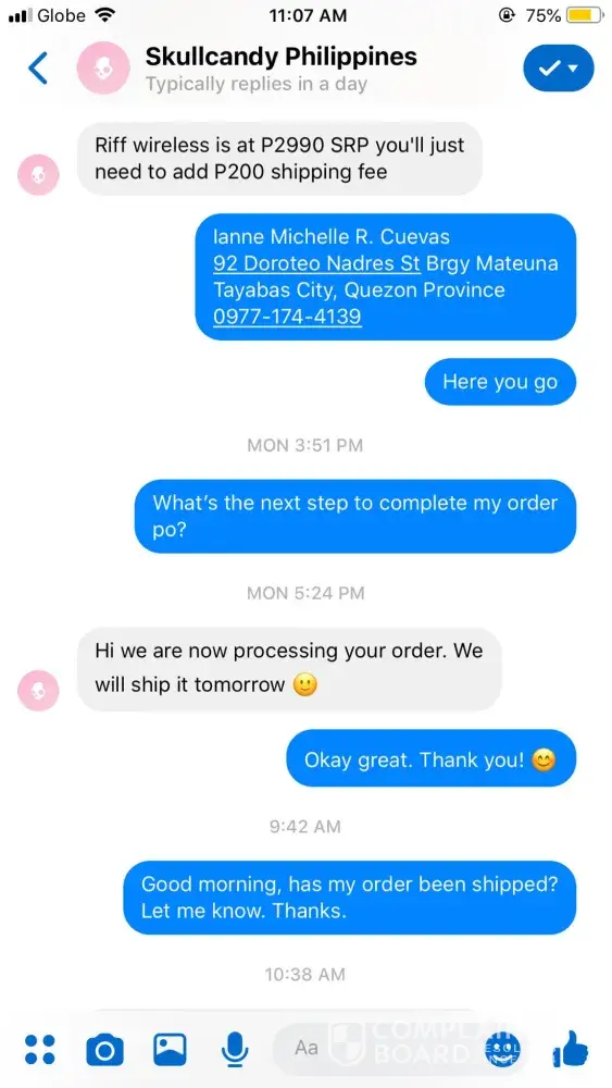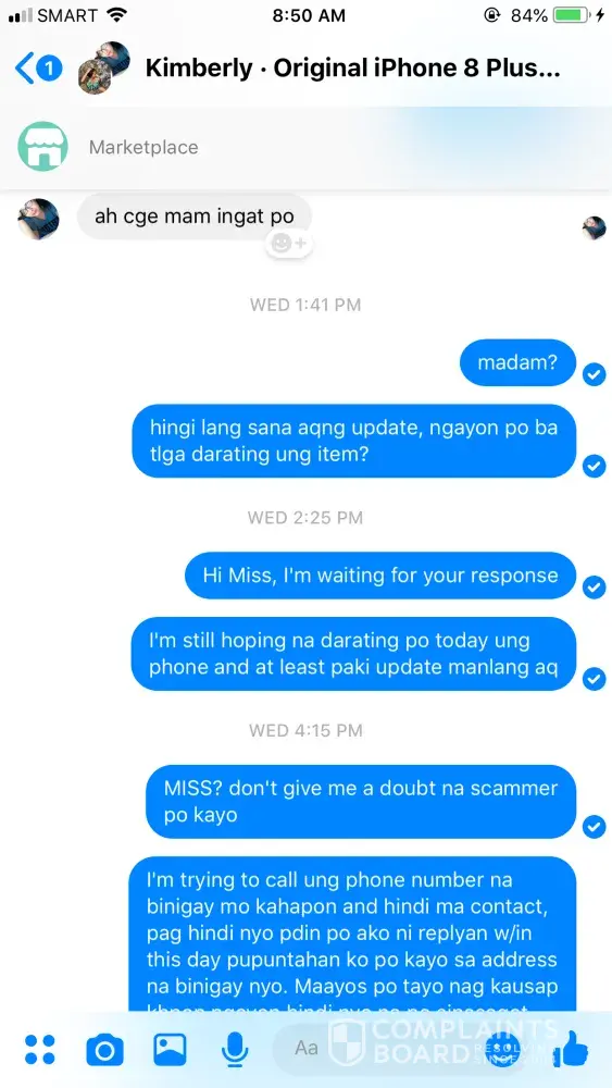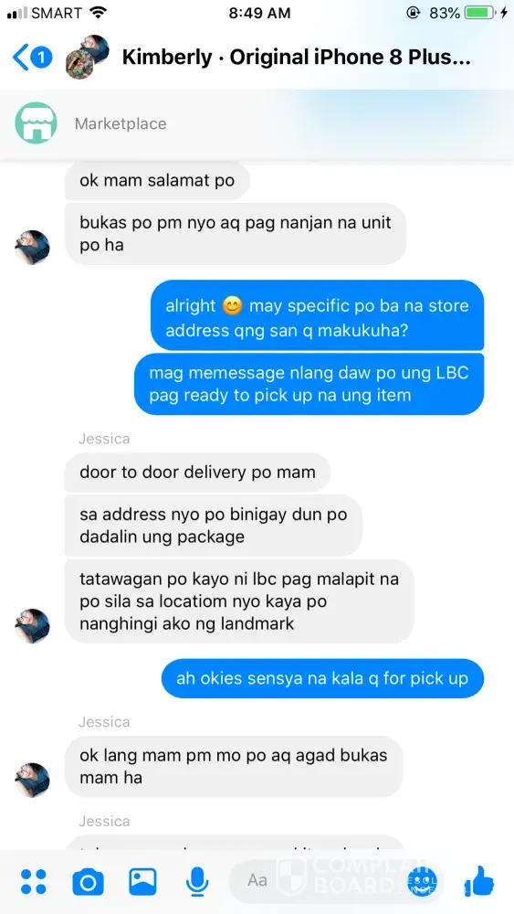 Up to now June 22 of 2019, I didn't receive any item at all. Also, i found out that the FB account this scammer is using was hacked. So, the picture that is showing in our conversation is not who he/she really is.