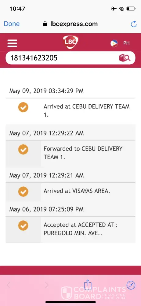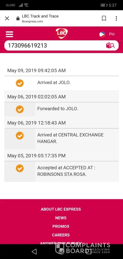 hi. i sent a watch last may 5 2019 at lbc robinson sta rosa but until now may 15 2019 status of the item is arrived at jolo. i already informed origin branch regarding this and they contacted delivery of jolo but no replies. i also emailed lbc customer support regarding this but got no answer. please update the whereabouts of my item. i need answers and updates!