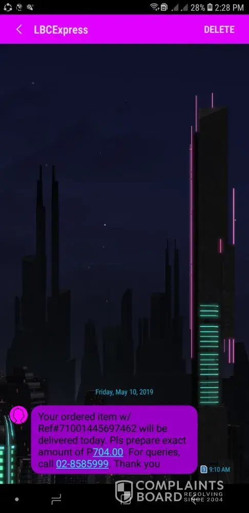 I would like to submit a complain regarding my delivery at LBC koronadal... I recieve a message informing me that my parcel arrived at their store last friday May10 2019... it is a door-to-door delivery it was not delivered during that day so I decided to pick up my parcel but to no avail they already return my parcel... kindly check your courier at this area... I attached a picture of message for further information.. thank you...