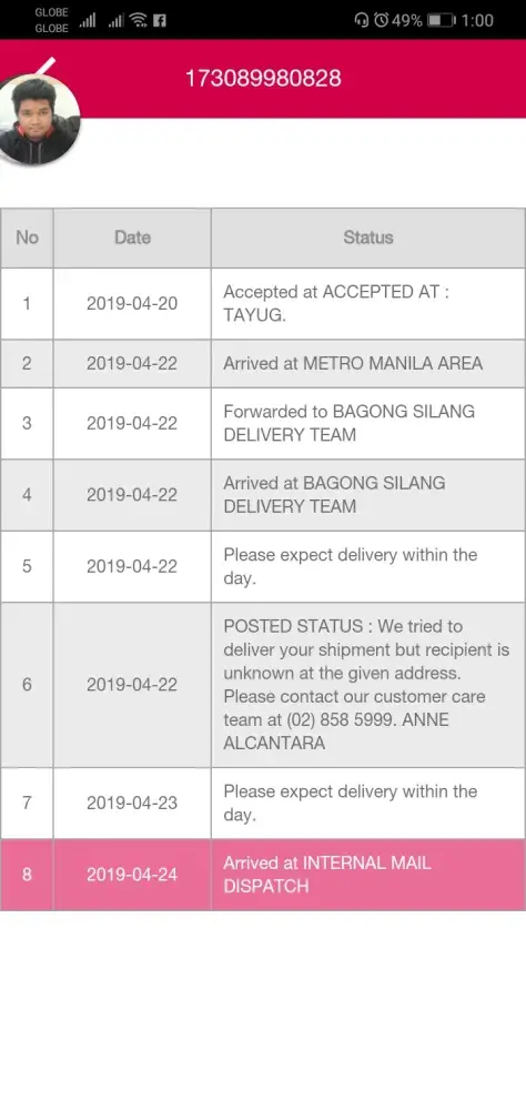 A parcel with the Tracking Number [protected], bound to Limay, Bataan, was scheduled to be delivered on April 29, 2019. But it was reported with "Shipment Issue" at 3:00 p.m. on that same day.