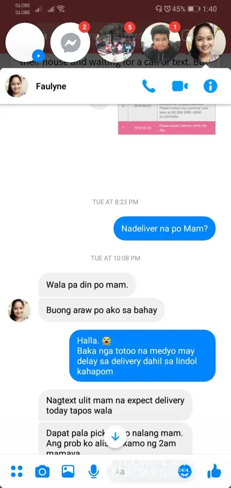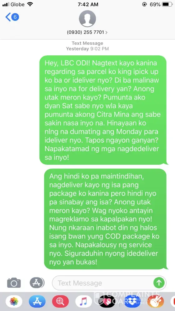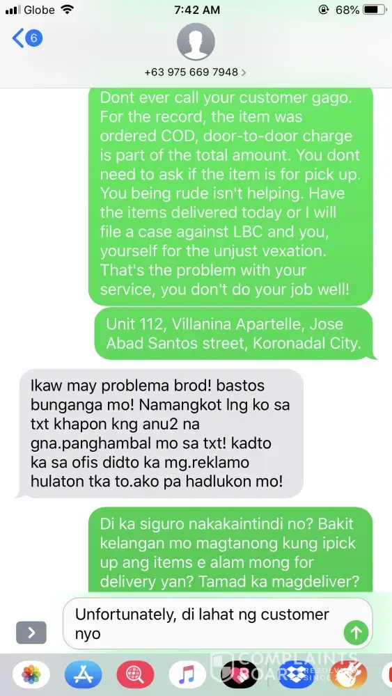 Earlier today, I texted him back about the inconvenience he got me in. He responded and even called me. I also tried to ring him. The irritating part was when he called me ‘gago' - thy to me is unjust vexation. He keeps on insisting that i go to their branch. So, I told him it is up to him if he's going to deliver the parcel or not.