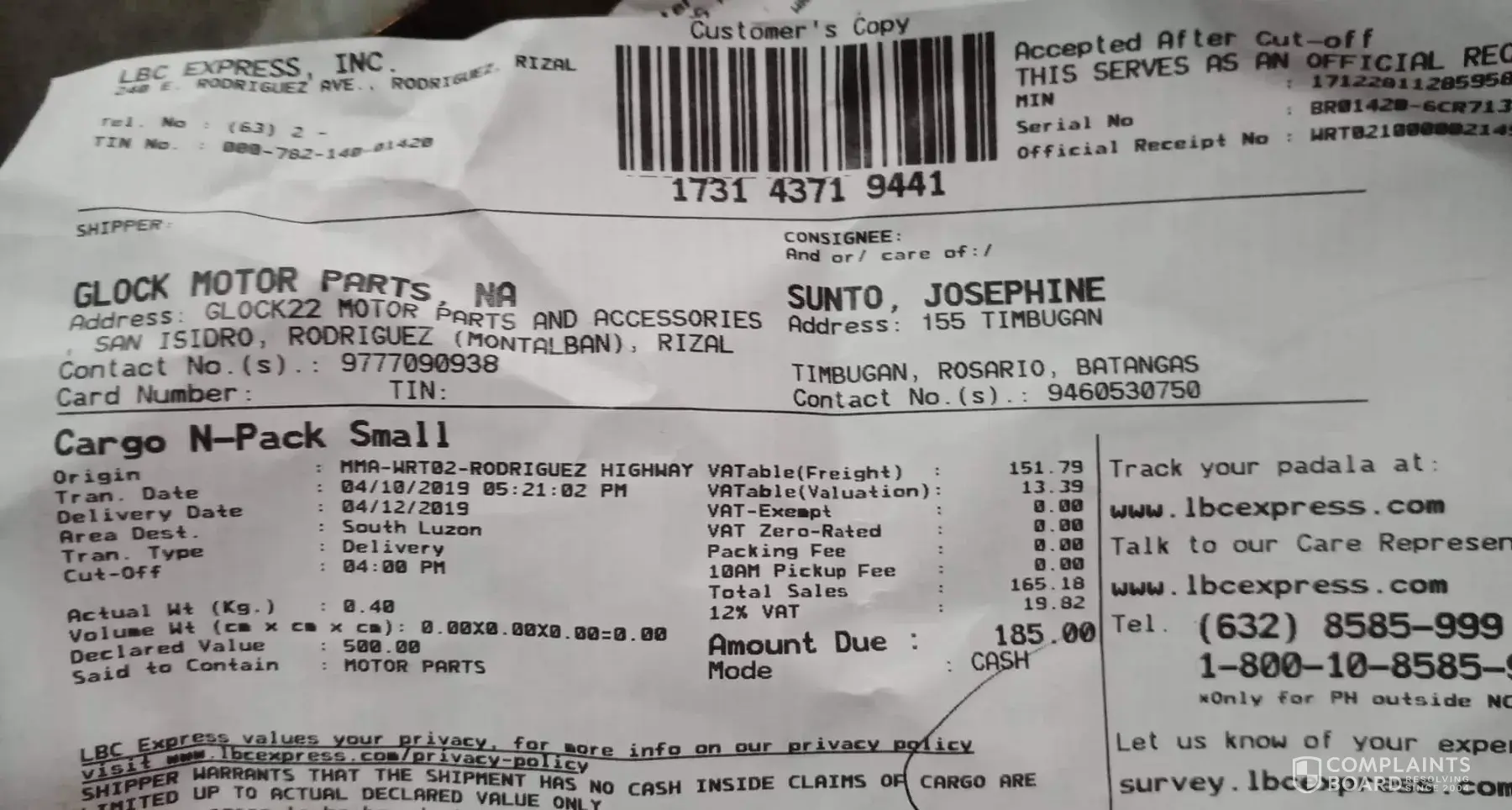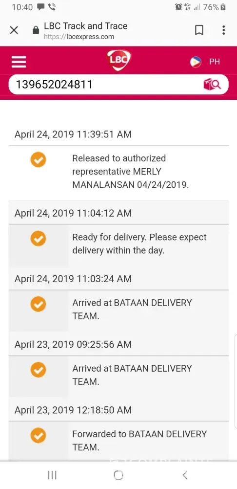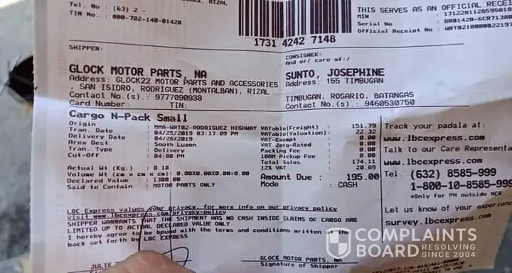 I am writing this letter of complaint on behalf of my client too, who was expecting to receive the parcel on April 29, 2019 by the LBC Delivery Team of Bataan (See attached).