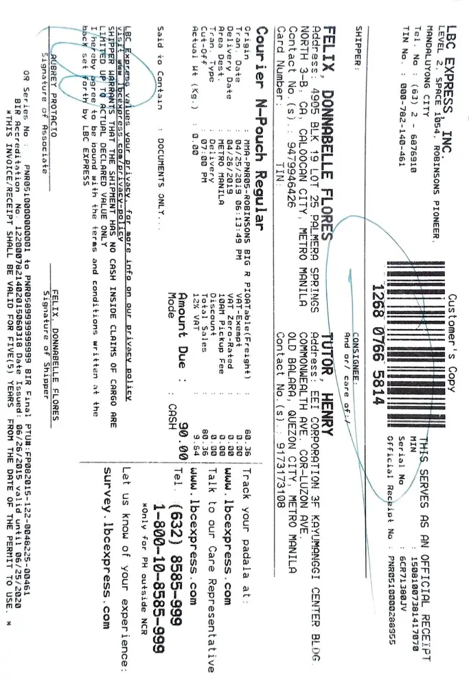 The document that I, Donnabelle Felix sent last April 25, 2019 6:13:49 PM at Robinsons Pioneer has not been received by the consignee Henry Tutor of EEI Corp. But when I checked LBC tracking service, it says it has been released to Yolly Cruz. But there is no Yolly Cruz working in EEI Corp. The document should be directly delivered to the consignee written in the courier pouch. Why did they deliver to an unknown person?