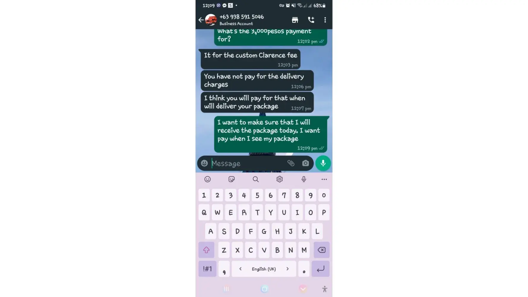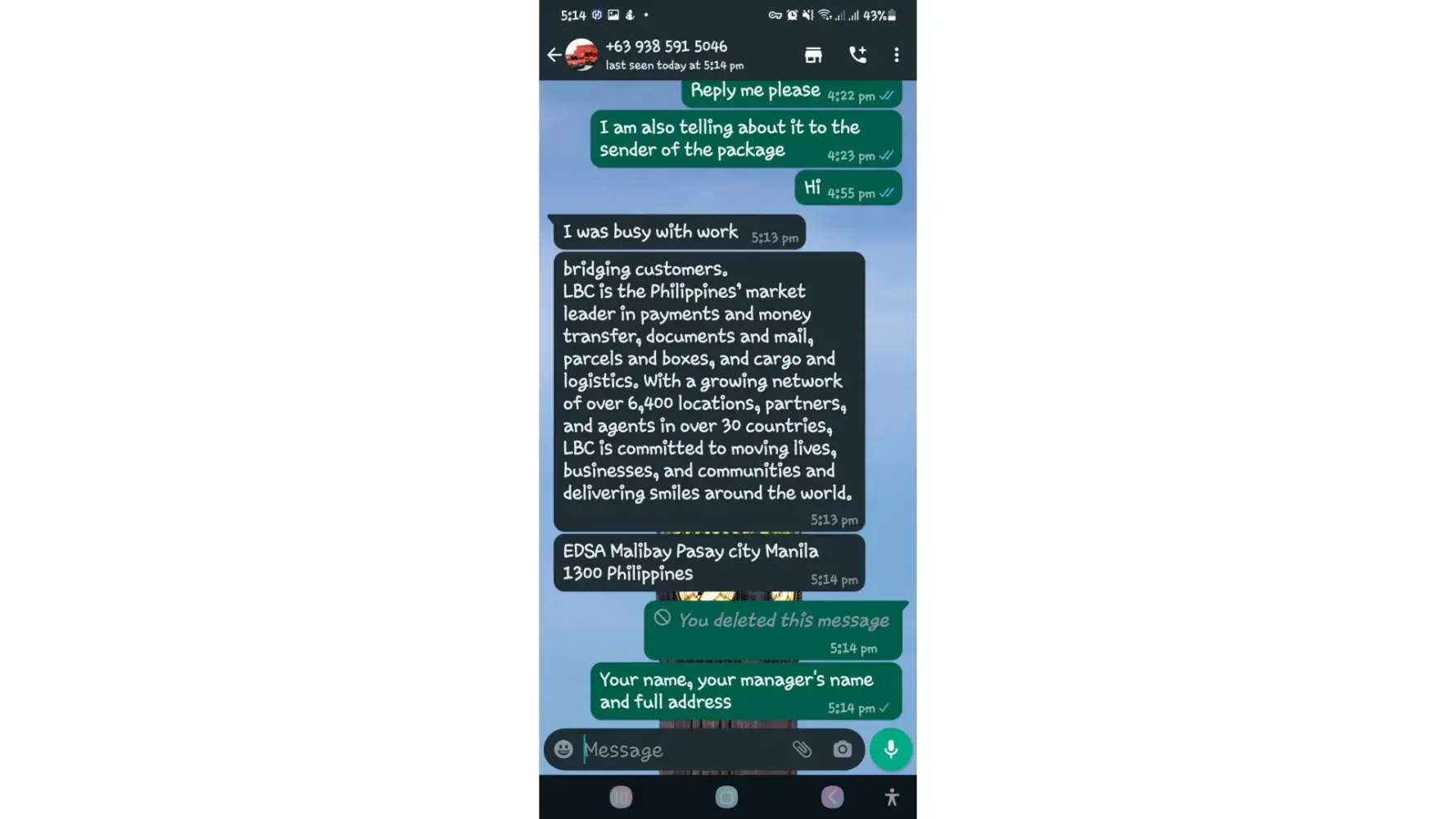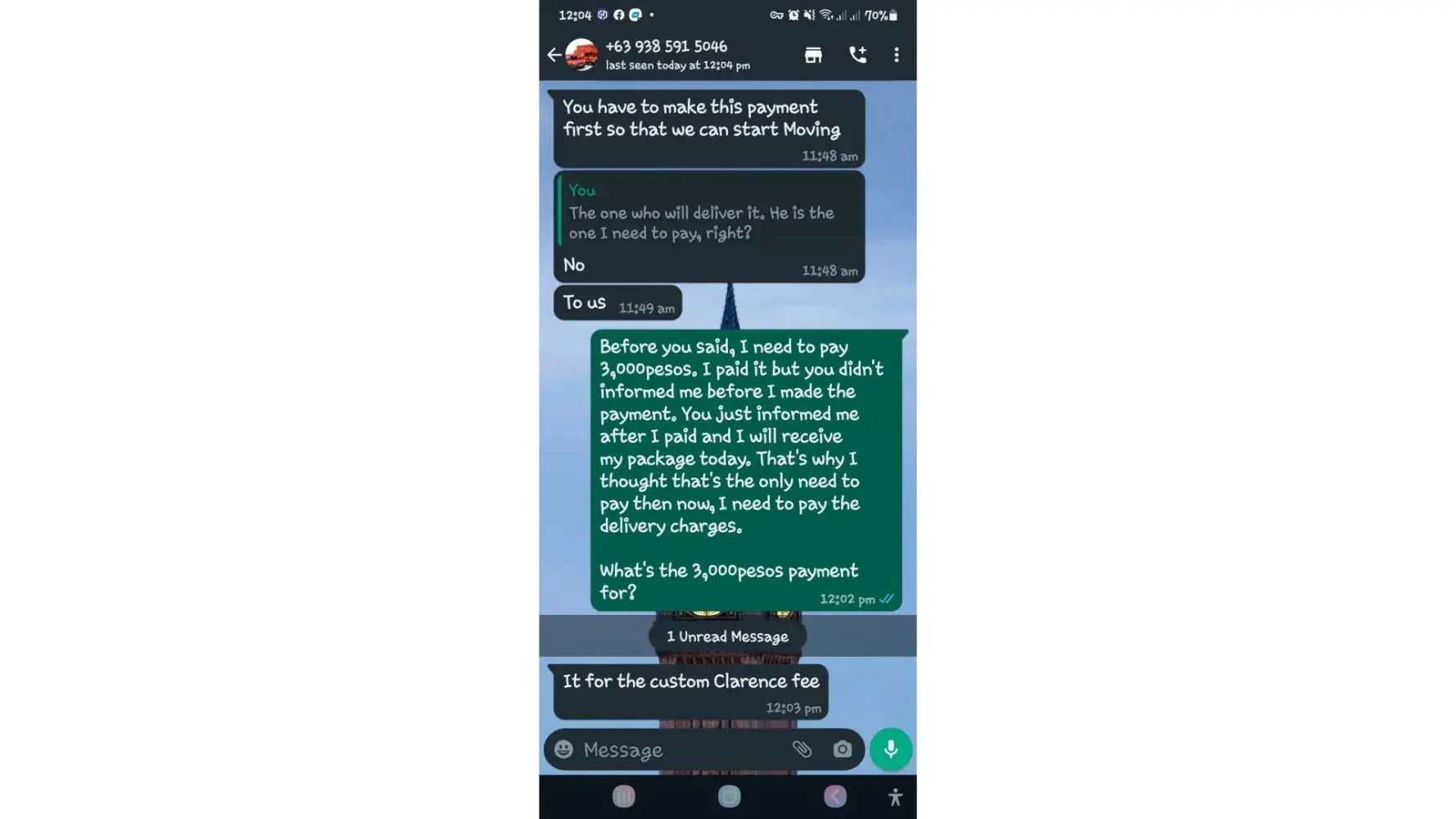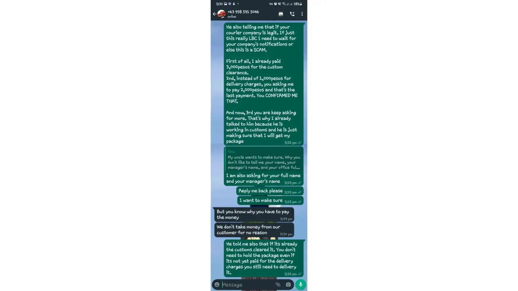 One of lbc agent sent me a message on my whatsapp number telling that my package is already arrived last january 25, 2023 @4:33am and they are asking me to pay the custom clearance worth 3,000pesos immediately. I already paid that last january 27,2023 @8:13pm then last january 28, 2023 @5:15am they sent me a message again they are asking me to pay for the delivery charges for 1,000pesos and they said that is my last payment and they assured it to deliver my package and I find a way just to pay it today, january 31, 2023,@8:47am but they said its not 1,000pesos anymore because I need to pay 2,000pesos now instead of 1,000pesos for the first payment they are asking for just the delivery charges. Until now they are still holding the package they are asking for more money that they want me to pay more its now worth 5,000pesos just to deliver my package they said the delivery man is not going to accept my package just to deliver it again that's why they are demanding for more money so they can deliver it to me. They are scamming me! They gave me a 2 options I need to pay 5,000pesos just for the delivery charges or I will pick it up but they said that I still need to pay them again before they will release my package.