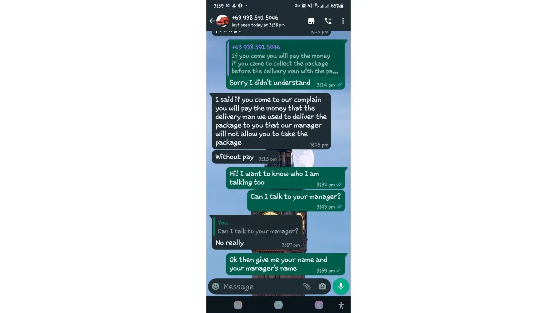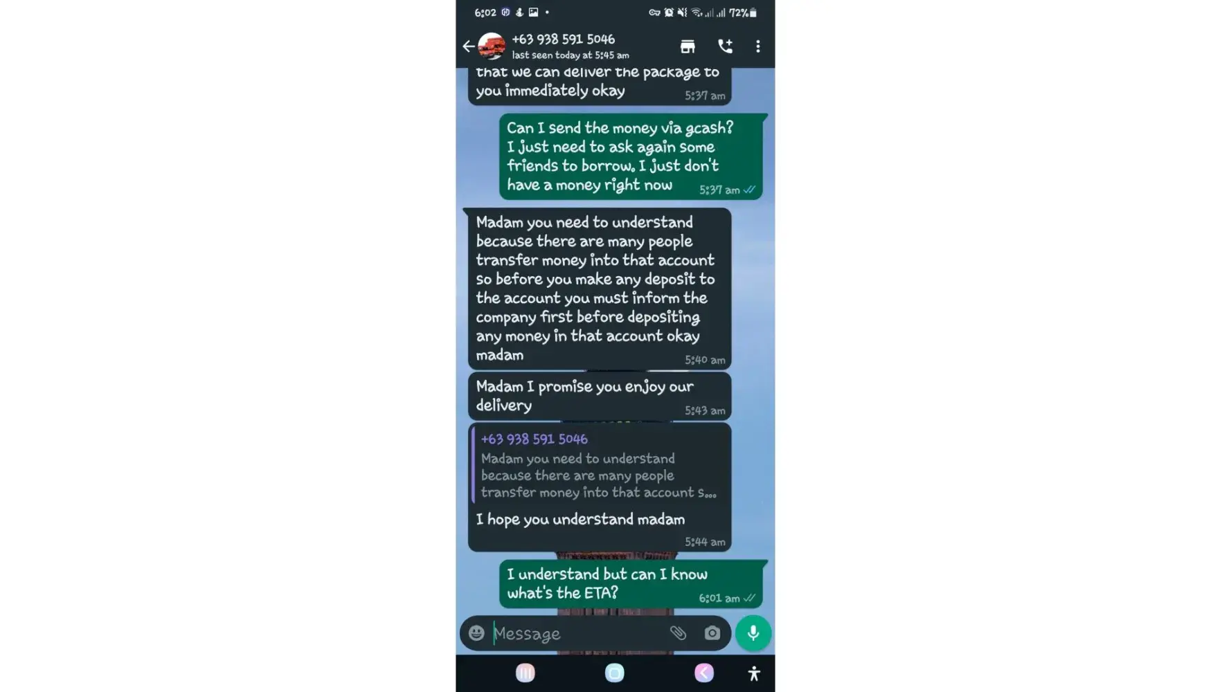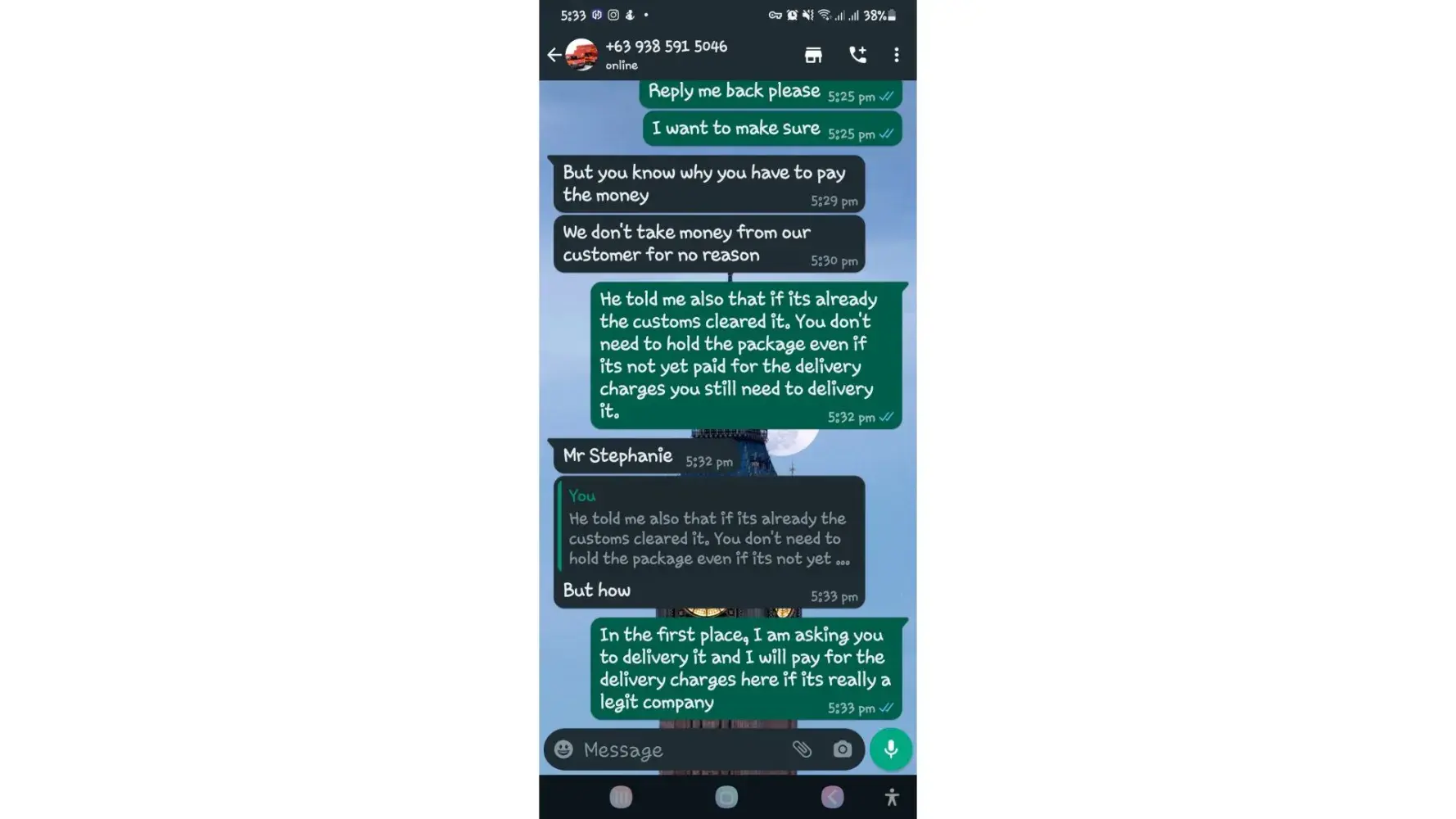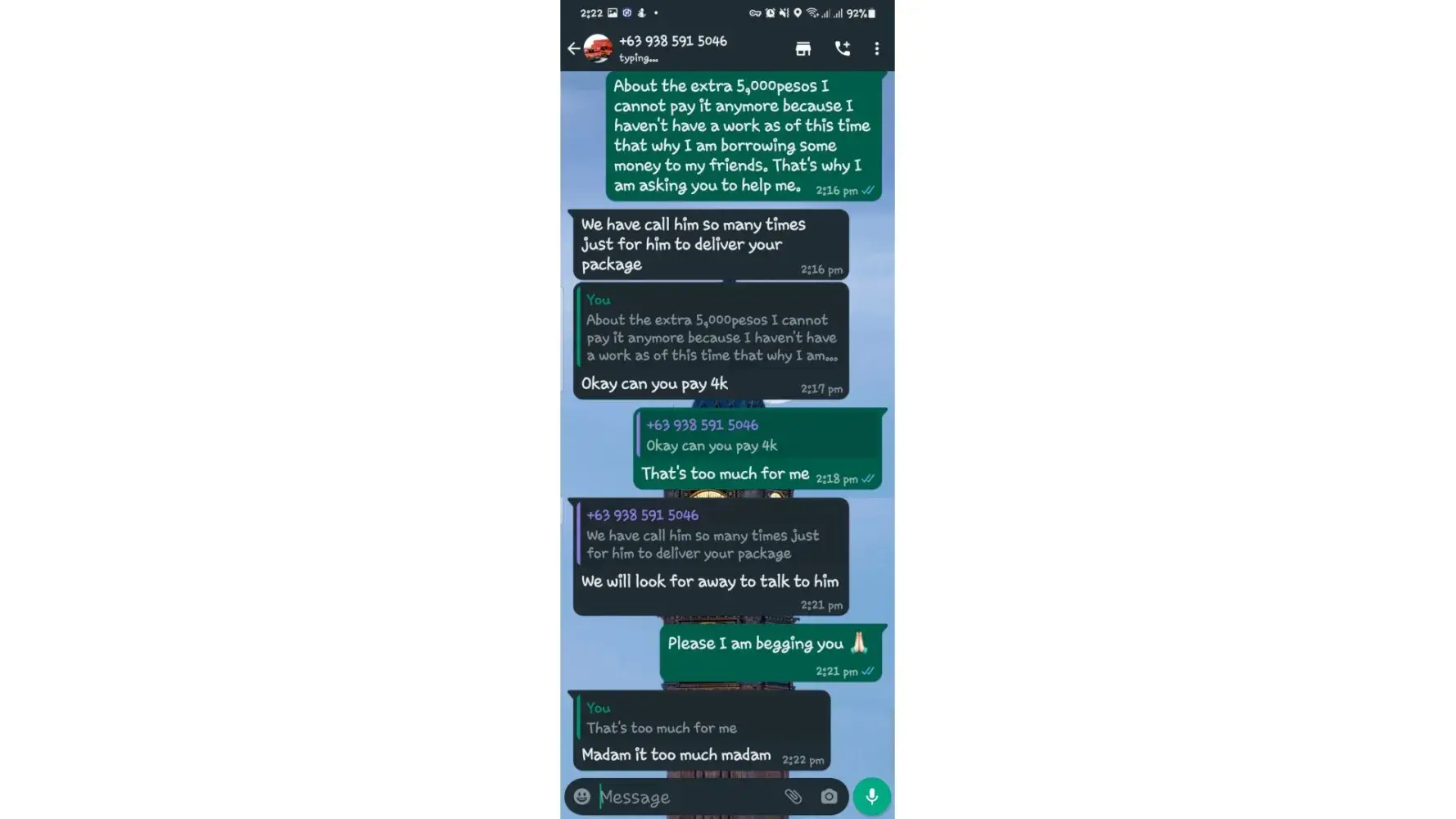 One of lbc agent sent me a message on my whatsapp number telling that my package is already arrived last january 25, 2023 @4:33am and they are asking me to pay the custom clearance worth 3,000pesos immediately. I already paid that last january 27,2023 @8:13pm then last january 28, 2023 @5:15am they sent me a message again they are asking me to pay for the delivery charges for 1,000pesos and they said that is my last payment and they assured it to deliver my package and I find a way just to pay it today, january 31, 2023,@8:47am but they said its not 1,000pesos anymore because I need to pay 2,000pesos now instead of 1,000pesos for the first payment they are asking for just the delivery charges. Until now they are still holding the package they are asking for more money that they want me to pay more its now worth 5,000pesos just to deliver my package they said the delivery man is not going to accept my package just to deliver it again that's why they are demanding for more money so they can deliver it to me. They are scamming me! They gave me a 2 options I need to pay 5,000pesos just for the delivery charges or I will pick it up but they said that I still need to pay them again before they will release my package.
