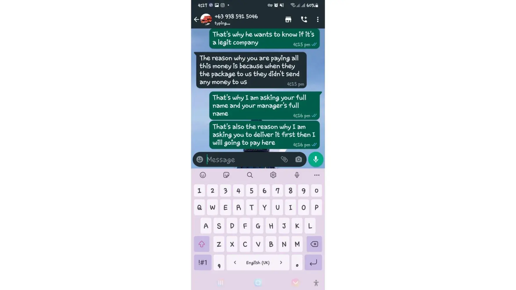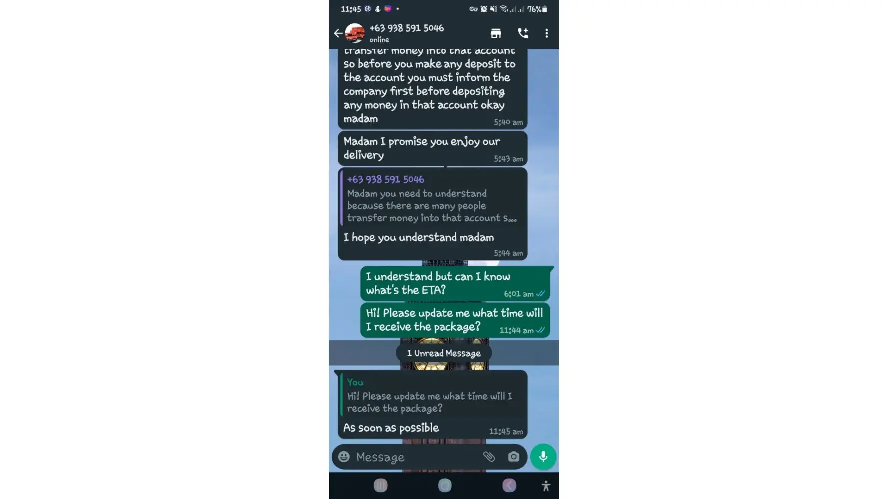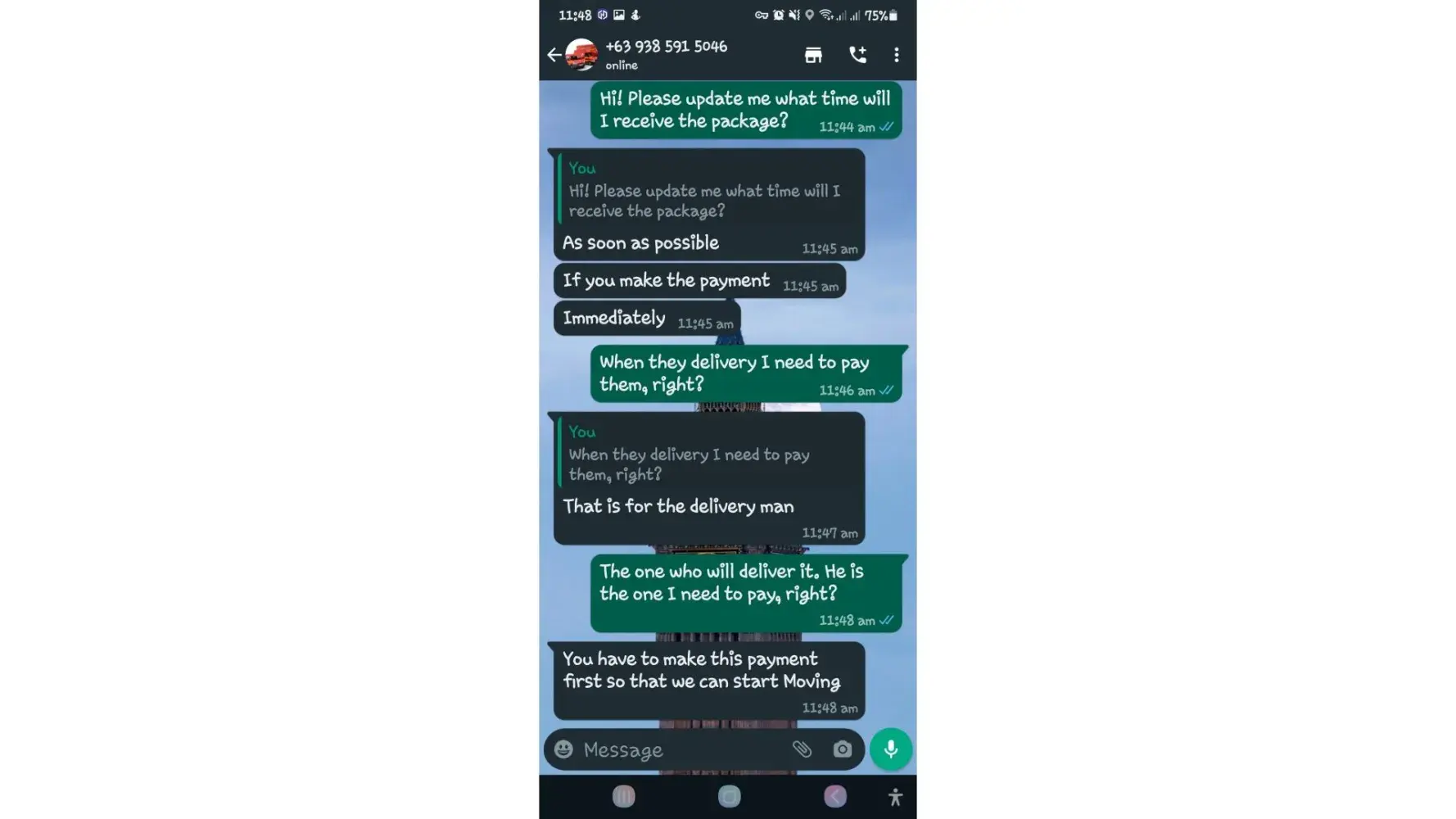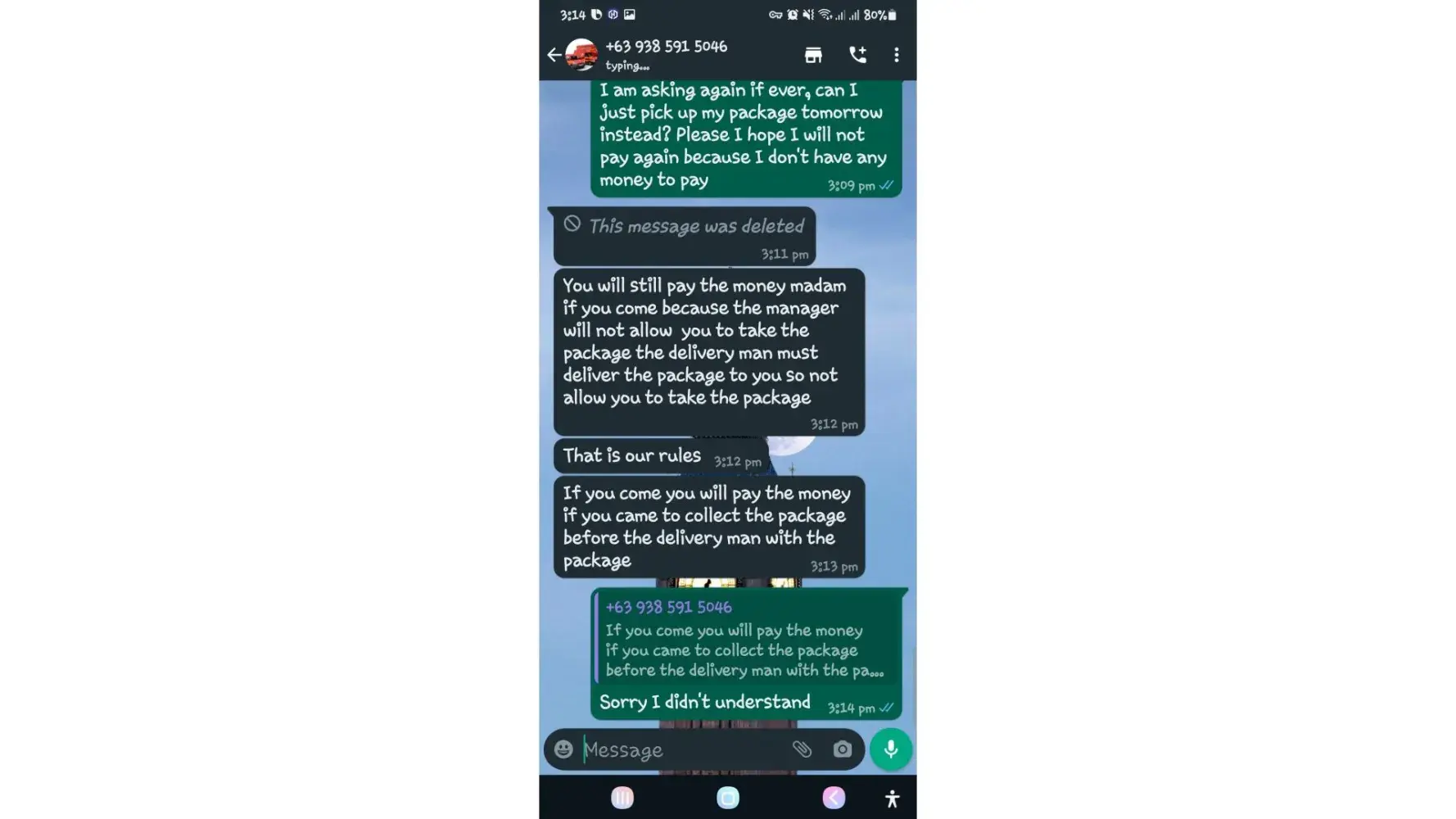 One of lbc agent sent me a message on my whatsapp number telling that my package is already arrived last january 25, 2023 @4:33am and they are asking me to pay the custom clearance worth 3,000pesos immediately. I already paid that last january 27,2023 @8:13pm then last january 28, 2023 @5:15am they sent me a message again they are asking me to pay for the delivery charges for 1,000pesos and they said that is my last payment and they assured it to deliver my package and I find a way just to pay it today, january 31, 2023,@8:47am but they said its not 1,000pesos anymore because I need to pay 2,000pesos now instead of 1,000pesos for the first payment they are asking for just the delivery charges. Until now they are still holding the package they are asking for more money that they want me to pay more its now worth 5,000pesos just to deliver my package they said the delivery man is not going to accept my package just to deliver it again that's why they are demanding for more money so they can deliver it to me. They are scamming me! They gave me a 2 options I need to pay 5,000pesos just for the delivery charges or I will pick it up but they said that I still need to pay them again before they will release my package.