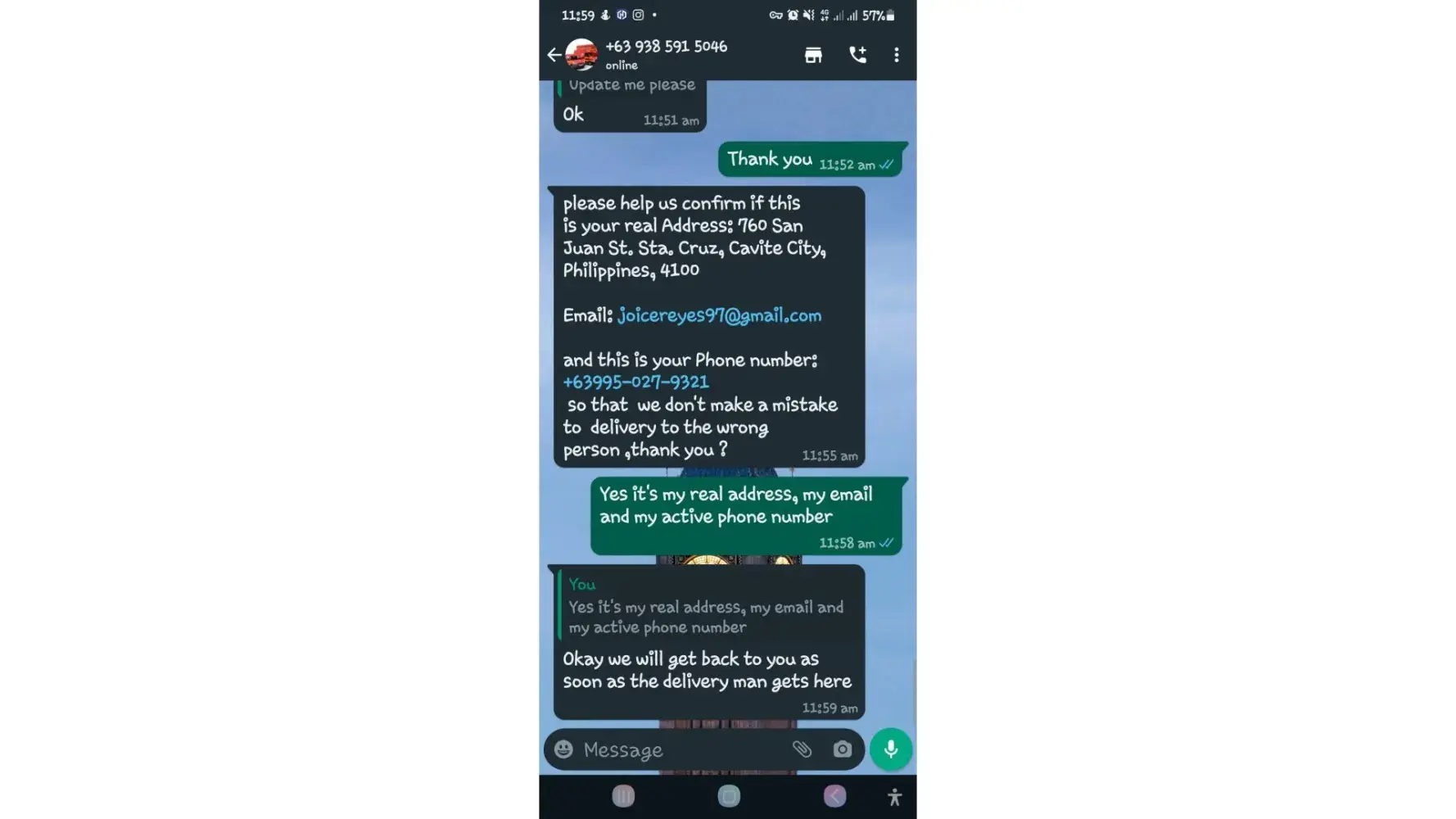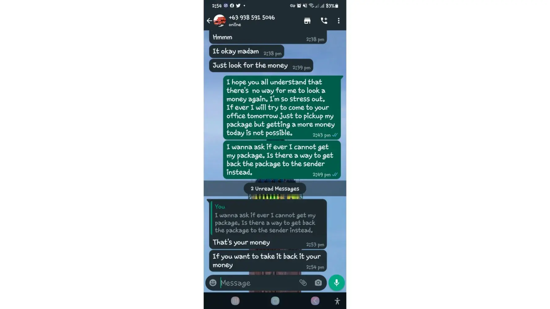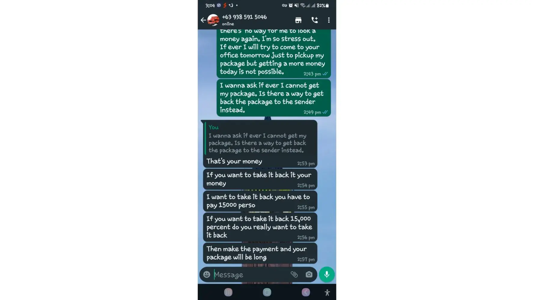I asked them if ever I didn't paid for the delivery charges and send it back to the sender instead because I cannot pay for it. They said, I need to pay 15,000pesos more just to return the package to the sender.