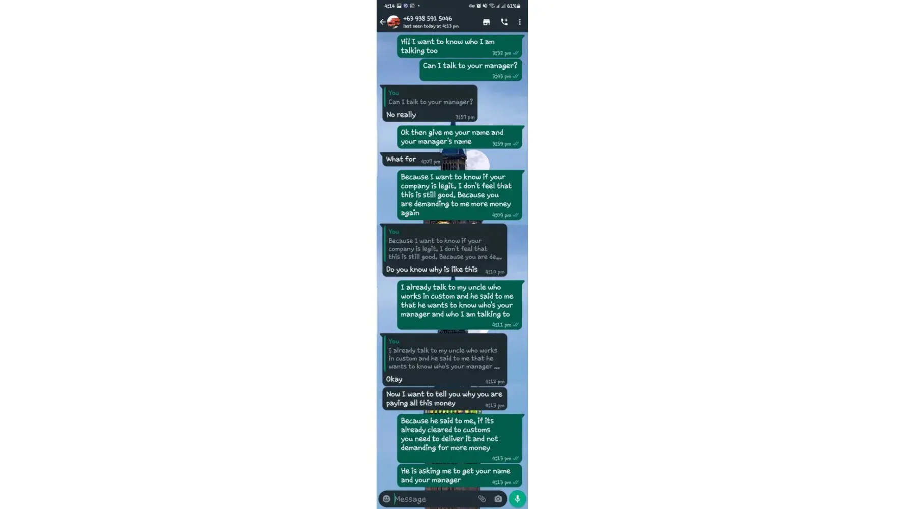 My uncle told me who is working in customs advising to now pay them because if I really need to pay for the delivery charges they need to deliver it first to my home address right after I just paid the custom clearance and they need to deliver it first then pay upon delivery but no because they are asking me pay it. They are still demanding to me that I need to pay again for 5,000pesos.