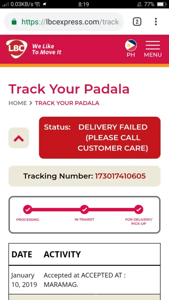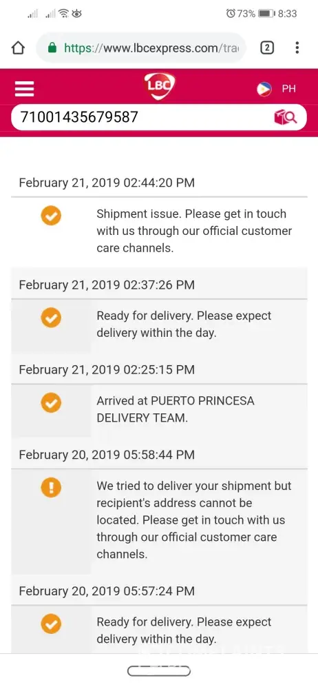 Good day, ive sent my cargo last february 22, 2019, expected delivery must be feb 22, 2019 according to their receipt provided w/ tracking#: [protected], the cargo arrived in tagbilaran delivery hub february 25, 2019, see how fast they are. They been out of their limit the items should be delivered. As of today the status is, "ready for delivery. Please expect delivery within the day". Today, february 28, 2019, the receiver didnt receive any items from lbc.