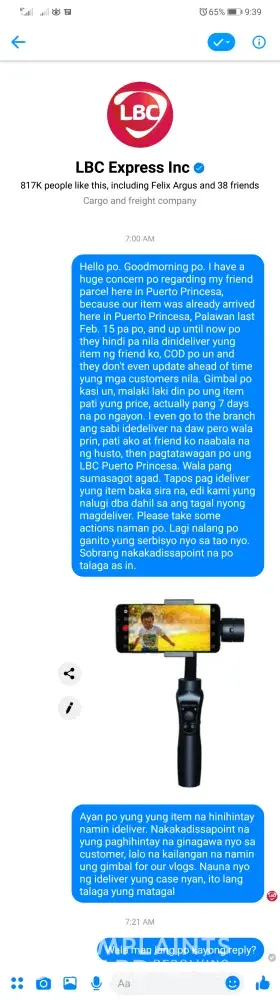 Hello po. Goodmorning po. I have a huge concern po regarding my friend parcel here in Puerto Princesa, because our item was already arrived here in Puerto Princesa, Palawan last Feb. 15 pa po, and up until now po they hindi pa nila dinideliver yung item ng friend ko, COD po un and they don't even update ahead of time yung mga customers nila. Gimbal po kasi un, malaki laki din po ung item pati yung price, actually pang 7 days na po ngayon. I even go to the branch ang sabi idedeliver na daw pero wala prin, pati ako at friend ko naabala na ng husto, then pagtatawagan po ung LBC Puerto Princesa, wala pang sumasagot agad. Tapos pag ideliver yung item baka sira na, edi kami yung nalugi diba dahil sa ang tagal nyong magdeliver. Please take some actions naman po. Lagi nalang po ganito yung serbisyo nyo sa tao nyo. Sobrang nakakadissapoint na po talaga as in. Prestigo 3 - axis gimbal yung item na hinihintay namin ideliver. Nakakadissapoint na yung paghihintay na ginagawa nyo sa customers nyo, lalo na kailangan na namin ung gimbal for our vlogs. Nauna nyo ng ideliver yung case nyan, ito lang talaga yung matagal. Ni wala man lang text or update yung LBC kung idedeliver na ba today. Hindi na po nakakatuwa talaga.
