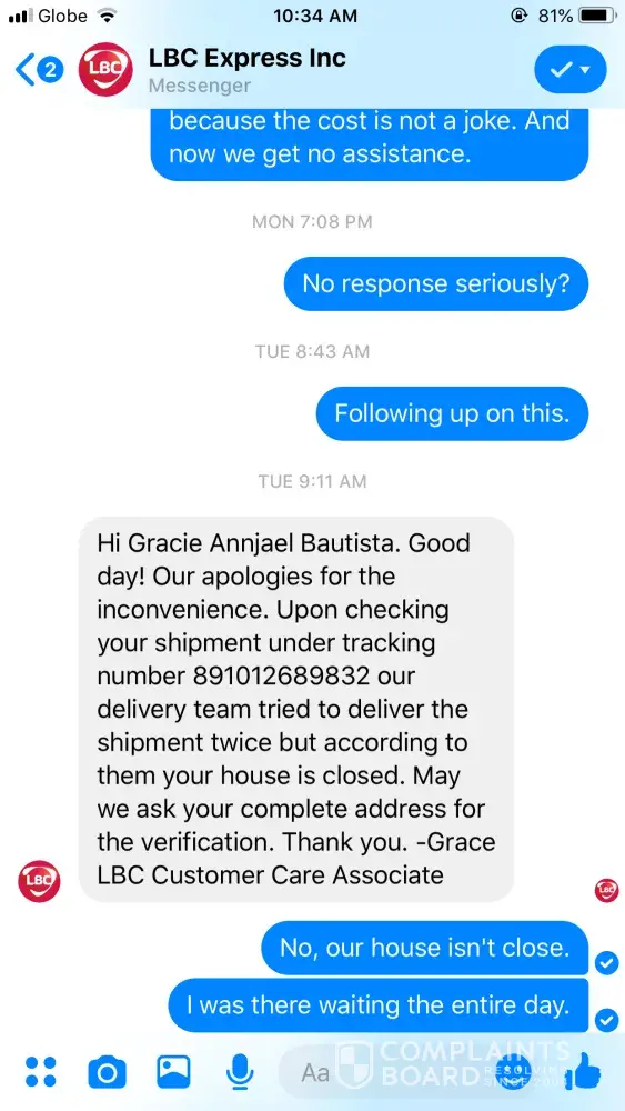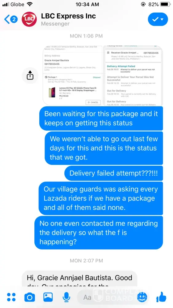 We asked our village guards if there's someone from lbc looking for us and even asked the next riders if we have a package and none said we have. Now, I tried calling your hotline since feb. 10 and until no one answers my call after making me wait. I messaged your facebook and the attached was our conversation. As expected, I got nothing but wasted time!