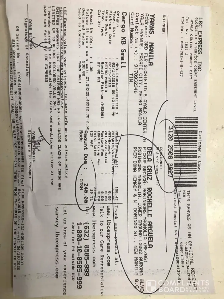 Okay so ganito ang nangyari. Thursday feb 7 kami nagplace ng order sa isang online seller and lbc nga ang napag usapang pagpapadalhan. Within 1-3 days daw ang expected days bago arrival nung supplements na inorder namin. Dahil nga busy, monday feb 19 na kami nakadaan sa lbc para iclaim na yung product. Ang kaso, nakakainit ng ulo kasi ang sabi nung isang employee doon eh received na under my name yung package nung friday pa 4:30 pm. Delivered daw sa boarding house na tinutuluyan ko. Ang issue ko lang eh bakit hindi sila nanghingi ng id para masigurado na yung totoong recipient nga ang pinagbibigyan nila. Worth php 6000 din yung product na inorder namin. Pinapupunta ako sa isang mas malayong branch ng lbc para doon ko daw isettle ang issue. Nakakabastos na. Today ko supposedly kailangan itake yung supplements na inorder para di lumala ang condition ko at para makaprevent ng complications. Nakakairita kasi hindi ko alam kung mababalik pa yung package nung pinagbigyan ng nagdeliver. I demand na icompensate yung mga gastos at incurred damages sa part ko as customer. Pinagkatiwalaan ang lbc pero ganyan? Nasa civil code pa man din ng konstitusyon ang mga obligasyon niyo lbc. Di niyo man lang gampanan maiigi. Hindi ito ang first time na nagpabaya ang mga empleyado niyo. Umayos kayo kasi hindi biro ang perwisyong dinulot niyo.