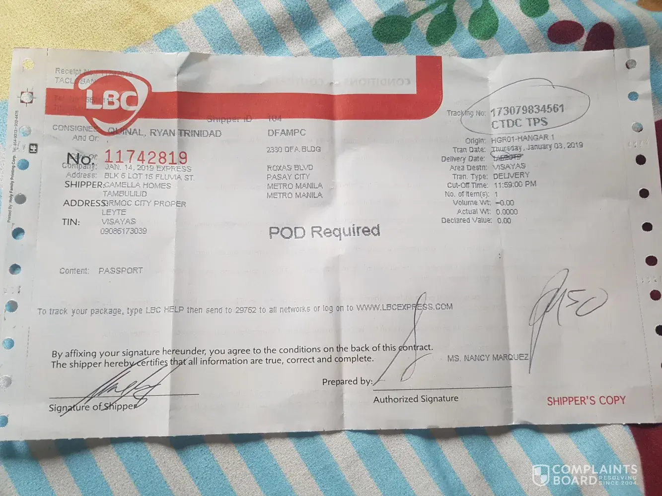 Last Jan. 3, 2019, I renewed my passport at DFA Tacloban and had it delivered. I tried to trace the tracking no. given at www.lbcexpress.com but "no result found". I am expecting for my package to arrive last Jan. 14, 2019 but until now I don't have it yet. I am waiting for my passport to be delivered coz I need it ASAP. Please HELP. Thank you. God bless!