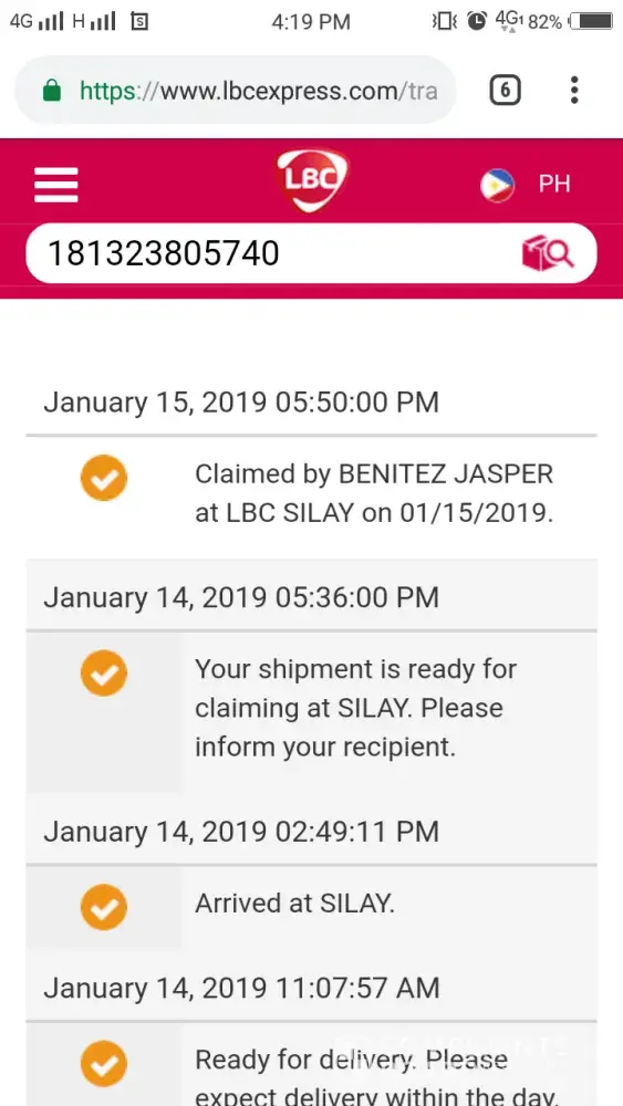 Somebody took the parcel shipped by my mother josefina J. Lagrito last 01/12/19 with tracking number [protected] which was supposed to be picked up by Jasper P. Benitez at LBC Silay City Negros Occidental branch. We tracked the parcel by using the tracking number they provided and it was claimed on 01/15/19. But when Jasper Benitez came today she found out that someone else took the parcel. Please accomodate my complaint as soon as possible. Thank you.