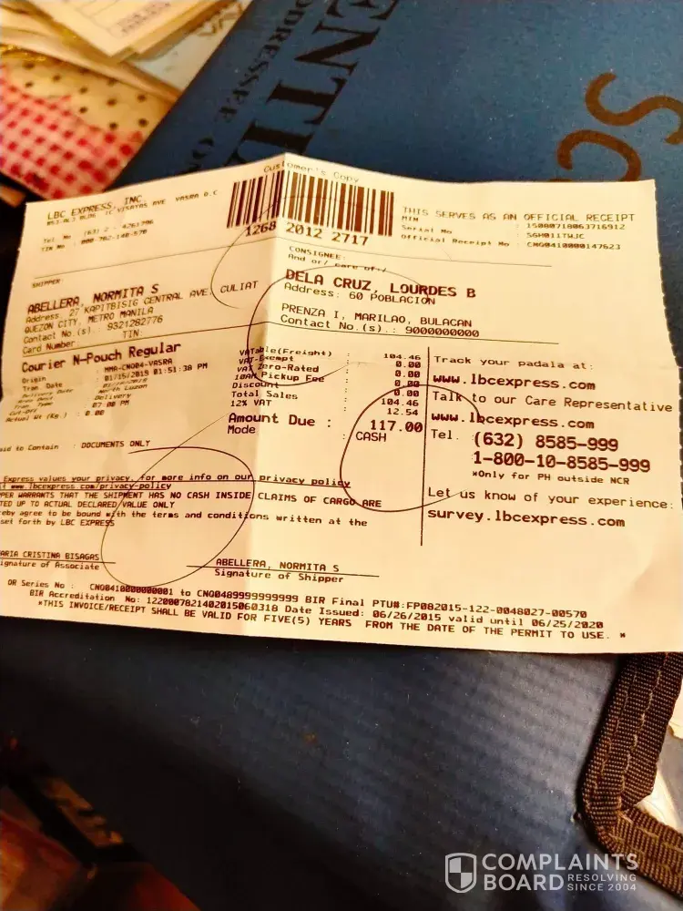 January 15, 2019 in the afternoon my mother went to LBC express Vasra, Culiat branch to send a document. She filled all the necessary forms with the correct name of the receiver (Lourdes B. Dela Cruz) and paid the amount and so she got the receipt with the details of transaction and tracking number of the document.