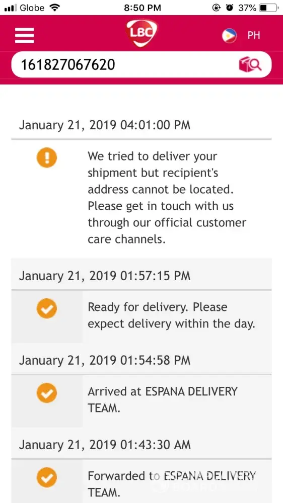 SO WHAT THE HECK HAPPENED TO OUR PACKAGE?! I used the Track and Trace feauture on your website and it was said there that the Package already arrived at LOWER LAGUNA DELIVERY TEAM on january 16, 2019 which is located at Binan City, Laguna. WE LIVE HERE IN STA ROSA, LAGUNA WHICH IS NOT VERY FAR FROM BINAN AT ALL!