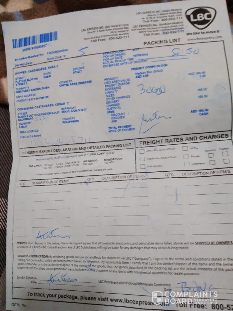 I am writing to file a complaint. I sent balikbayan box on August 30, 2018 to Dr. Dodjie Marasigan at Marasigan Dental Clinic, Gaisano Capital Mall, Pagadian City, Zamboanga Del Sur, Philippines. The Bill of Lading number [protected]. The LBC agent here in Tallahassee, Florida.