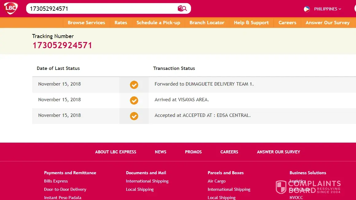 Since november 15, 2018 the parcel has been forwarded to dumaguete delivery team 1 and arrived at visayas area (november 15, 2018 at 12:26:24 pm). and at the same day the parcel was accepted at edsa central. however, the parcel is not yet delivered to the recipient until now. kindly deliver it in an urgent basis because the recipient is going abroad and her flight is on november 20, 2018 at 6:15 am.