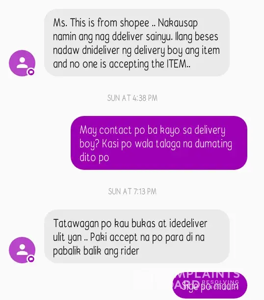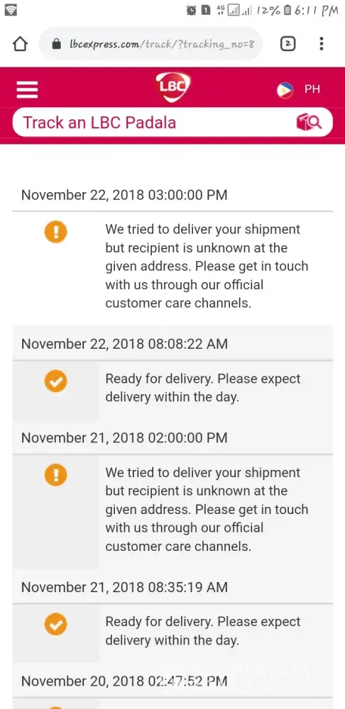 I ordered a product in Lazada which is expected to arrive on November 20, but on November 16, it updated my order in which it is ready for delivery within the day, so I expected it to be delivered but wasn't. So, I expect that it will be delivered again on November 20 so I waited. But on November 19. Monday, it updated again that it will be ready to be delivered within the day and yet again, I waited, but nothing had been delivered. I got a message in which it says, "We tried to deliver your shipment but recipient is unknown at the given address. Please get in touch with us through our official customer care channels.". It's kind of weird that I am unknown at the given address because I really provided my address clearly and concisely. I hope that you can fix this. Here is my tracking number: [protected]. You can contact me through [protected]. Thank you!