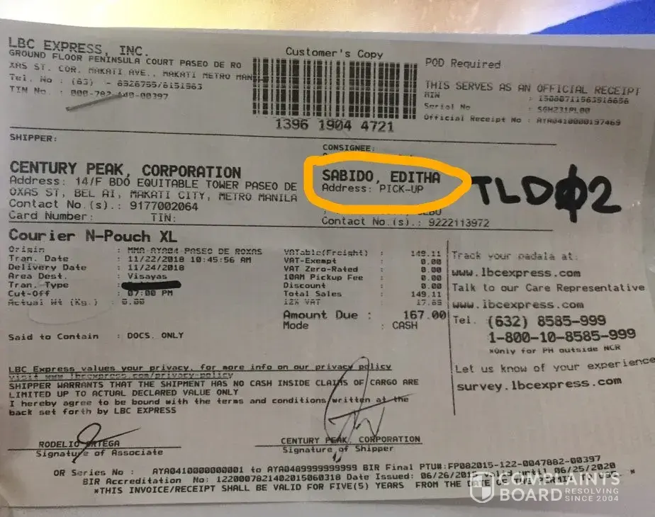 But not this time. I've sent a document to Ms.Editha Sabido last Nov. 22, 2018, w/ tracking number: [protected]. So since she is the consignee, she should be the one to pick-up the document right? not unless she authorize to do so on her behalf. But it didn't come that way. so frustrating and unsafe!
