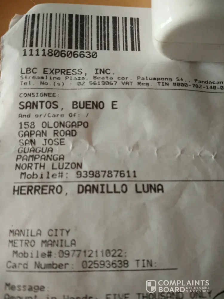 i would like to file complain regarding the money i send to Bueno E. Santos, 158 Olongapo Gapan Road San Jose Guagua Pampanga. [protected]