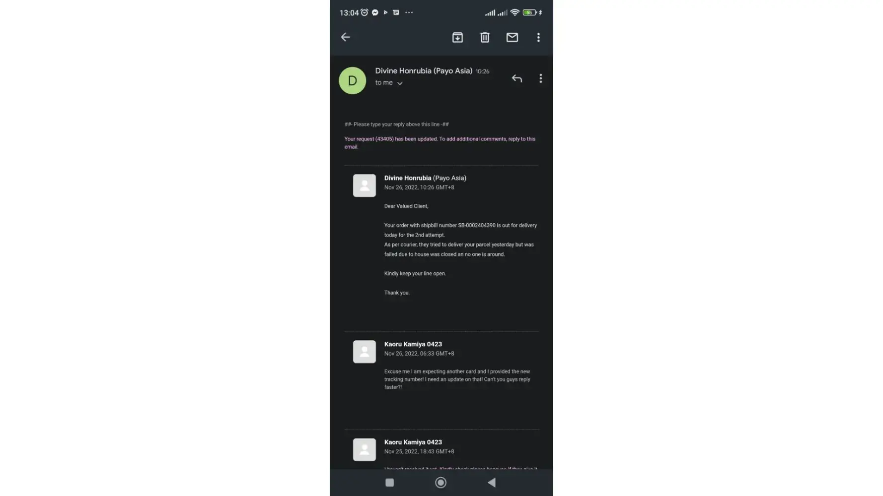My document was supposed to arrive yesterday (November 15,2022), based on the tracker as well as your message from Viber. But until now (November 16), it hasn't arrived yet. I urgently need that document and due to the delay, other plans are on hold as well.