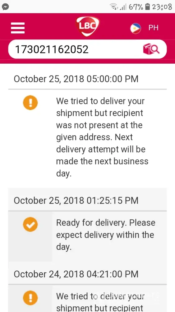 Yesterday, when I checked my phone around 3pm. That was from the lbc deliverer. He said that he would deliver my good that day. But before that, I havent received any notice from them that they would deliver my purchases in that certain day because I was expecting that I would be delivered to me on Nov. 4, 2018. So I call him that maybe they can call or text me or my mother when they would deliver it to me today because he told that today would tge last day that they would delivwr it to me or else they would forward my items back to the sender. Today, early in the morning I can them and yes tgey said to me that they would deliver it to me around 11am. But now its already 2:36 pm and i called him and now he cannot be reached in the phone. I texted them many times and they are not respond. I spent the whole day waiting for my order. But they were cooperating when even just a call or a text from them. They should have gove notice the day before they should deliver the items. Thanks. Hoping there would an action taken for this to not happen again in the future. Because this happen to me already twice.