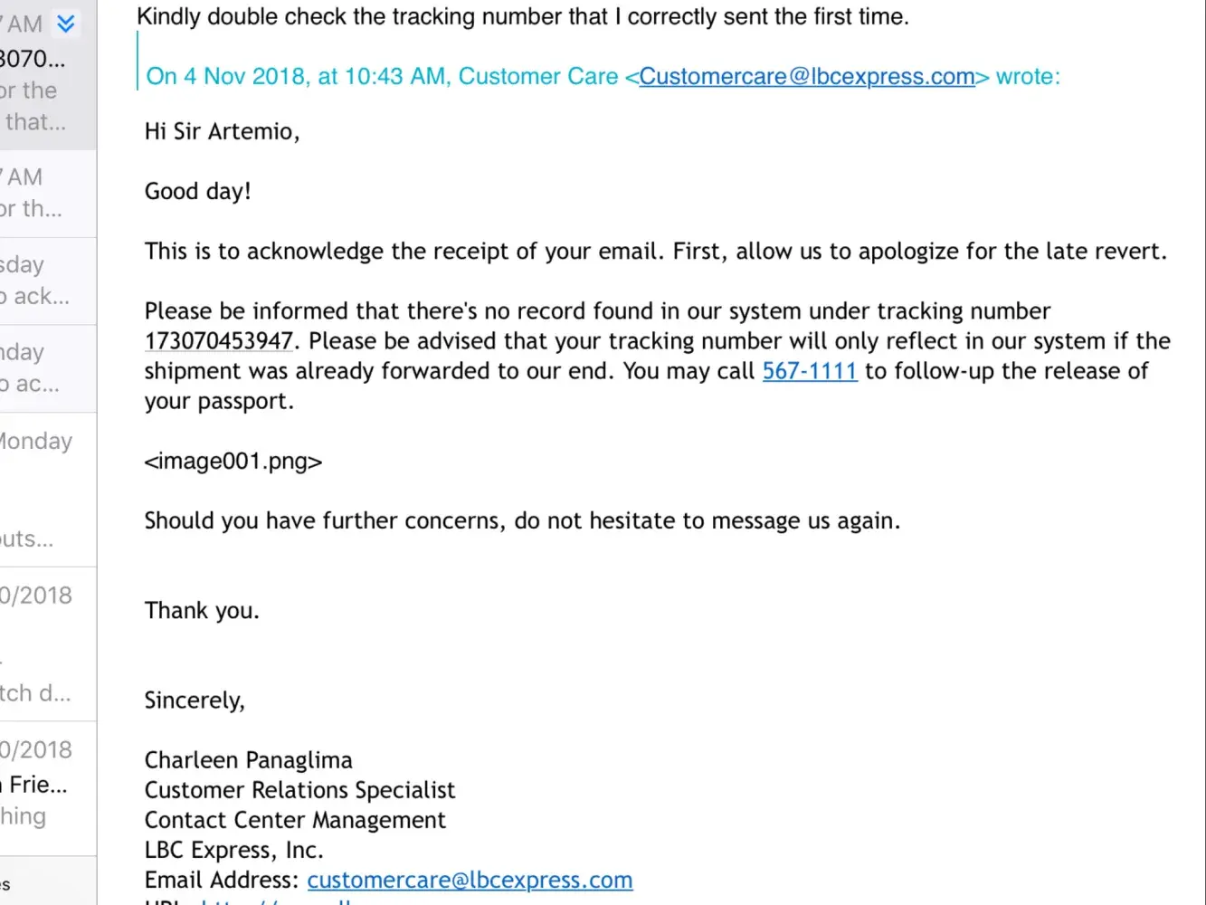 Receipt no. is [protected]. It was a birthday gift to my son's birthday (Nov. 01). Received a sms confirmation from LBC that my package was received by my wife last Oct. 29, good to hear that. But when I called my wife yesterday (Nov. 02), she said that they didn't received yet the package.