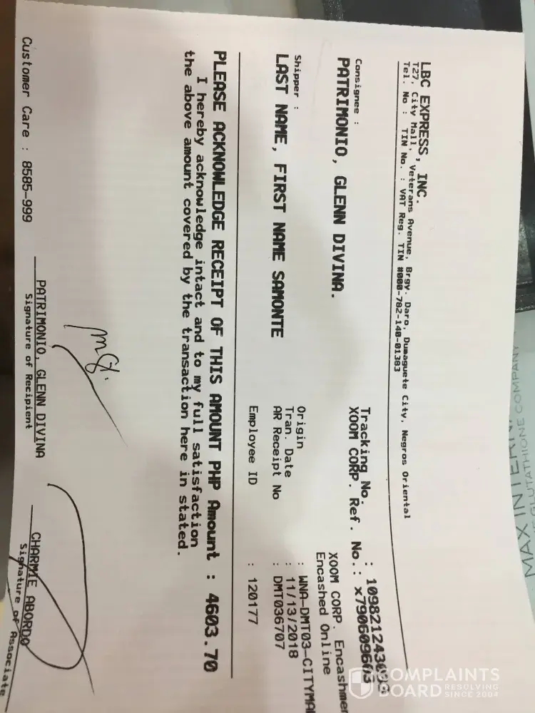 Last Nov 11, lunch time I went to LBC CityMall located at First St, Dumaguete, Negros Oriental to claim my remittance (payment for my online business) from an International country worth Php 4, 603.70. When the teller/frontdesk ask me to sign the consignee part of the form, being curious, i signed that form returned to her . The name under consignee was Patrimonio, Glenn Divina whom I dont know. SO I ask the teller/frontdesk that maybe, I could not affix my signature since i do not realy know this person. Since she already en-cashed my money, she can no longer view my trxn, as per her. And so, she ask me to return the money bcause she will email the issue i encountered. Until today, there's no response/reply to the email they've sent. Now, LBC, even this small amount really affects my small business because of your slow reply. I dont know whats wrong in your system, me and my client checked our trxn but we cannot really find the mistake or even wrong encoding of the details.
