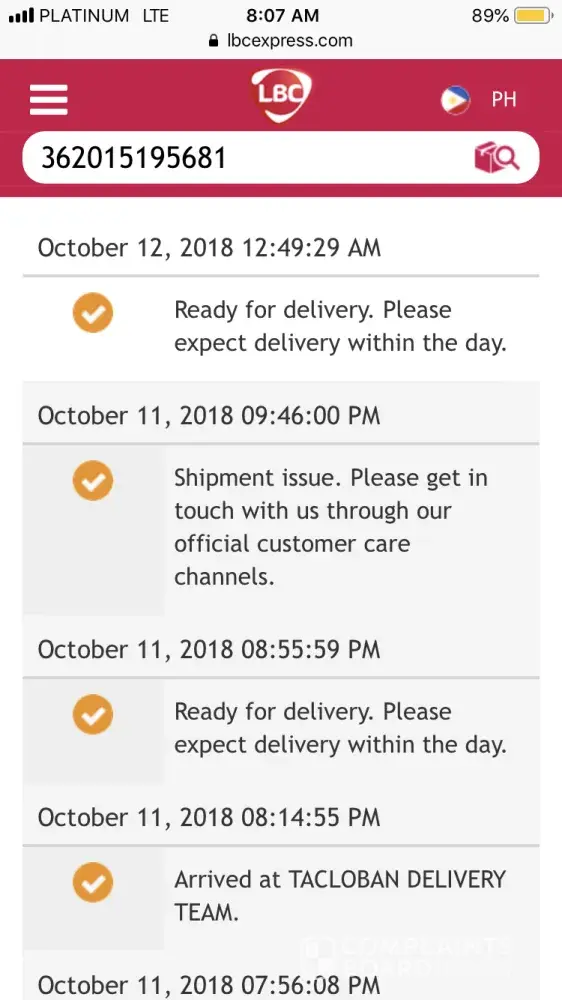 It says in the LBC tracker that my parcel has an issue and I should get in touch with the customer care channels dated 11 Oct at 9:46 PM. But there's an update dated 12 Oct at 12:49am that it is ready for delivery. Please note that this is a pick-up service to LBC Robinsons Tacloban.