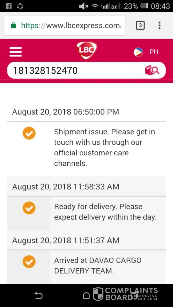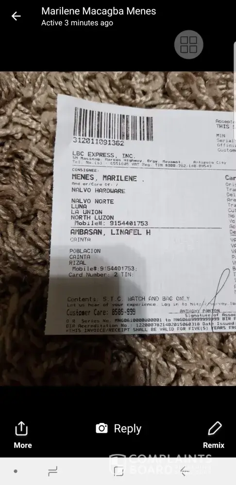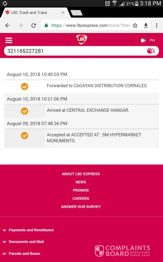 Gusto lo lang ipaabot sa kinauukulan ang aking reklamo tungkol sa ipinadala kong pakete patungong lagawe ifugao, na nakapangalan kay miss Karen Cabbigat noong Aug. 9, 2018 na hanggang ngayon ay di pa natatanggap, inihulog ko sa Gerona branch, galit na ang buyer ko dahil walang napaparating na pakete, trinack ko ngayong oras na ito at lumalabas n di na i forward, bakit kailangang umabot ng halos isang linggo ang pakete na hindi kumikilos na di man lang ninonotify ang sender o ang receiver considering na both parties ay may cp no. Matagal na akong tumatangkilik sa lbc pero dismayado ako sa serbisyong hindi maayos na maging dahilan upang masira ako sa iisang kliyente na magreresulta sa pagkasira ng pangalang na i put up ko regarding online selling, maliit na halaga pero katapat ang pagkasira ng buong pagkatao ko.